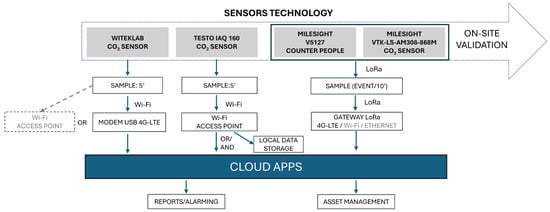 The counter people is configured locally via Wi-Fi (2.4 GHz), but it transmits measurements using LoRaWAN®, which is a low-power IoT protocol that can be adapted to large areas or environments with limited infrastructure. This device sends compact data packets to a gateway that connects to the cloud server, reducing the risk of data loss and simplifying the implementation. Figure 4 illustrates the key components of the two sensor systems (environmental parameters and people counting) and the data collection/transfer processes.