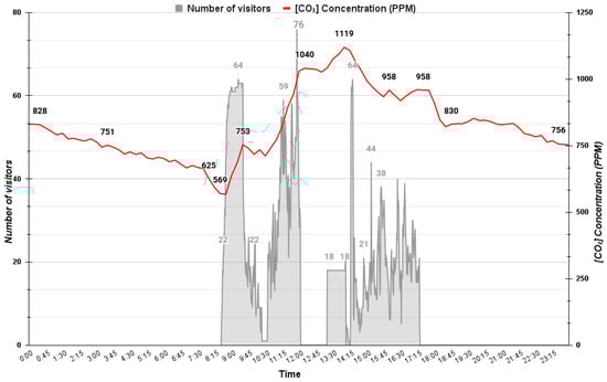 In the enclosed/confined types of spaces, a higher indoor concentration of CO2 is usually caused by people breathing, inadequate ventilation, and a complex spatial geometry. The continuous presence of people in poorly ventilated spaces can lead to an increase in temperature and relative humidity, as well as a cumulative increase in CO2 levels over time. Many studies related to this topic have been conducted, primarily in residential settings, classrooms, offices and other workspaces [,,]. In VCC studies, CO2 is an important constraint which results in a progressive reduction in PAOT on the site and, as the visiting hours progress, the site reduces its capacity to safely accommodate people over time.