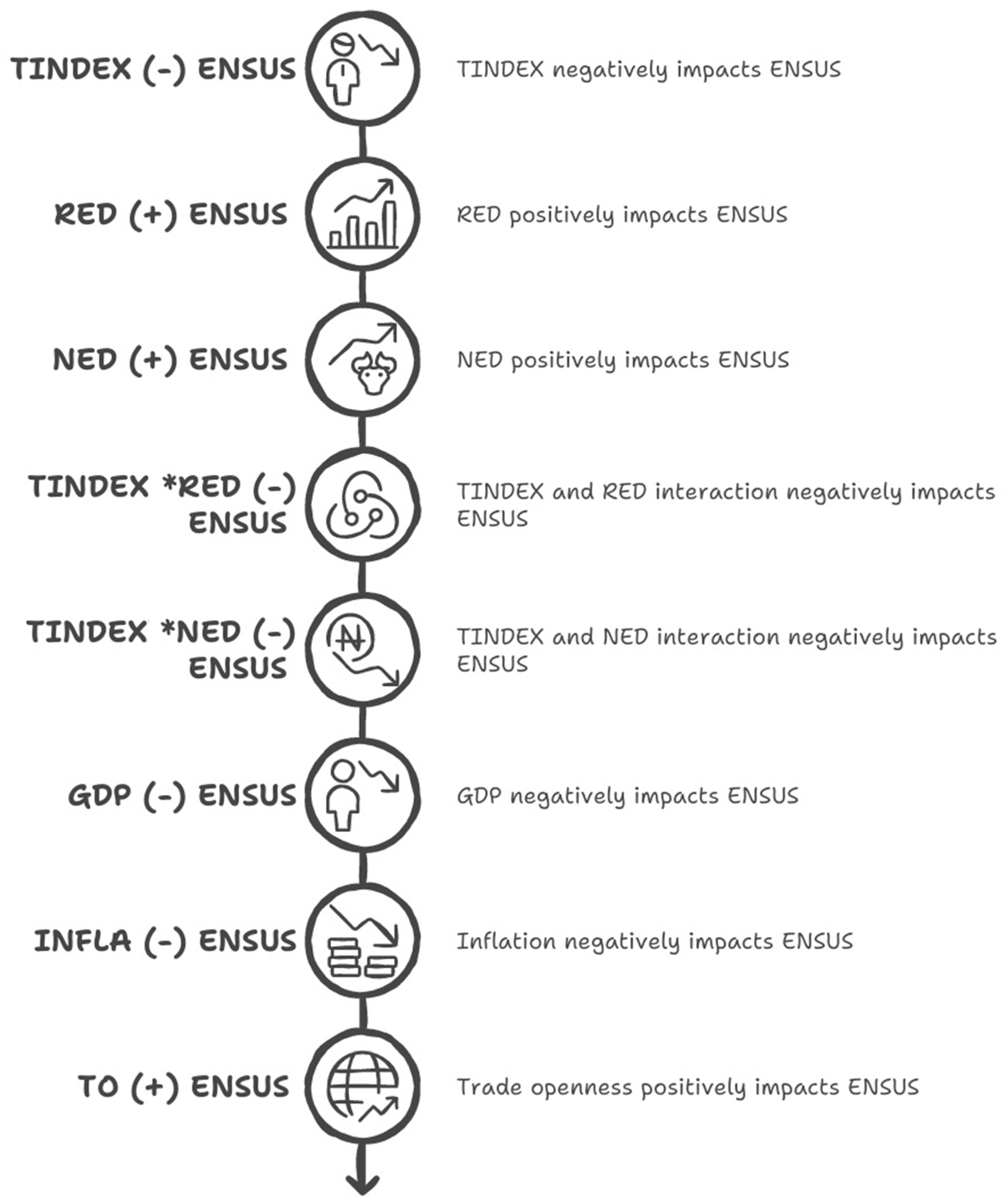 ENSUS, TINDEX, RED, NED, GDP, INFL, and TO represent environmental sustainability, renewable energy development, nuclear energy development, gross domestic product, inflation, and trade openness, respectively.