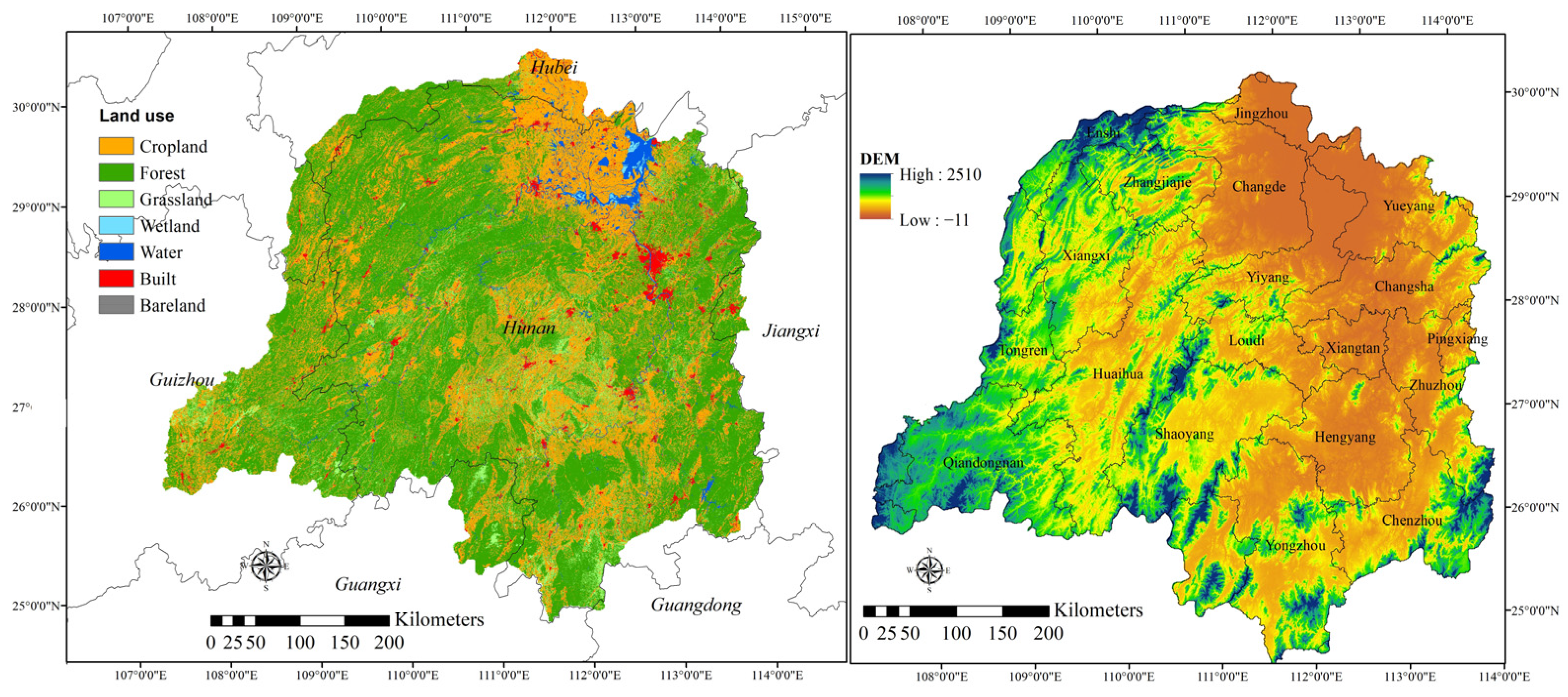 Figure 1. Location of the DLB. (Left) land use type; (right) elevation.