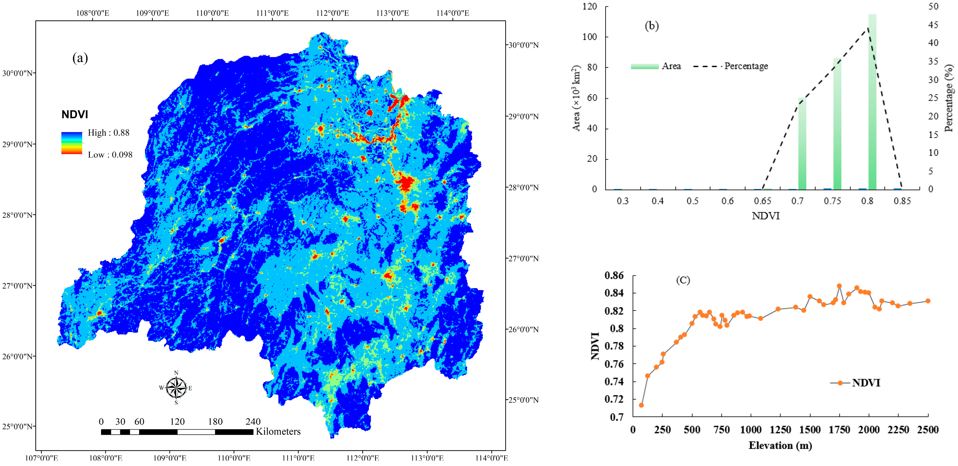 Figure 2. Spatial patterns of annual average NDVI. (a) Spatial distribution of annual average in DLB; (b) the area percentage of different annual average NDVI; (c) its elevation dependence in DLB.
