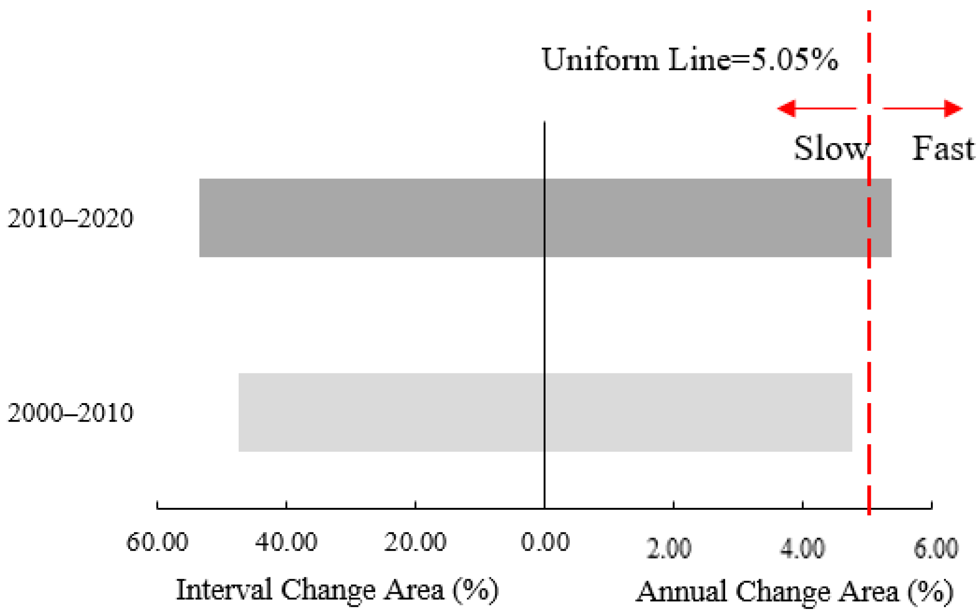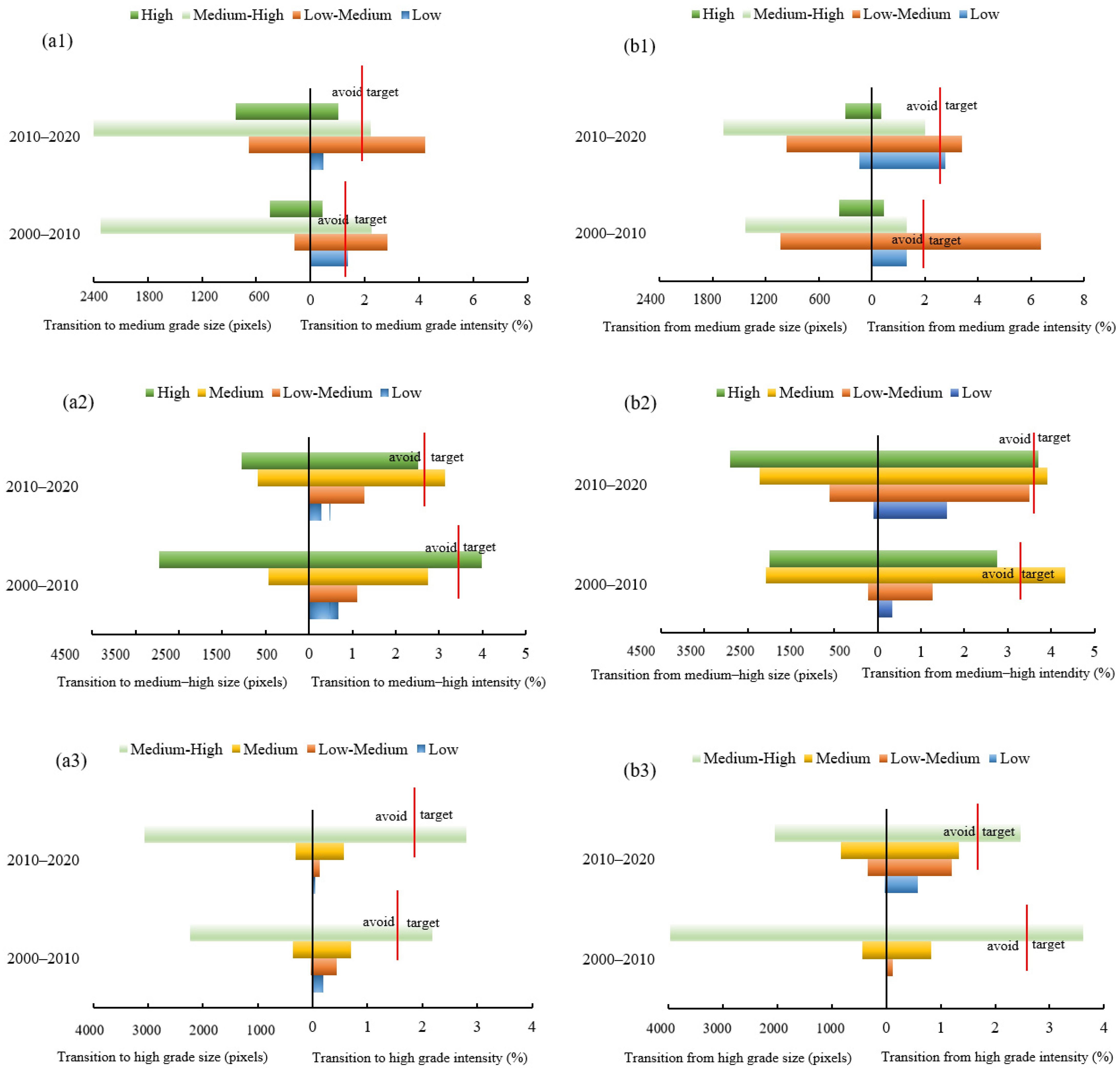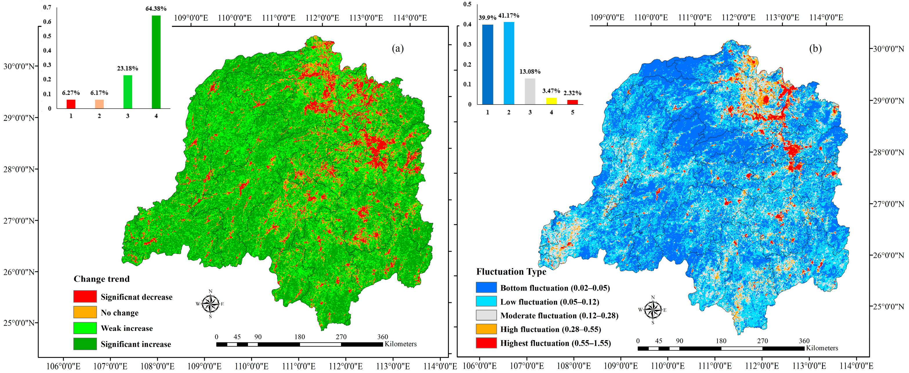 Intensity analysis, as proposed by Aldwaik and Pontius [45], offers a hierarchical approach for quantitatively analyzing land use and land cover change. It is suitable for analyzing two or more categories at different levels in two or more periods. Using a transfer matrix, land use change intensity was analyzed with time, category, and transition level, with each level offering a more detailed examination [45]. Similarly, the distribution of different NDVI level changes in a region during different time periods can be similarly investigated.
