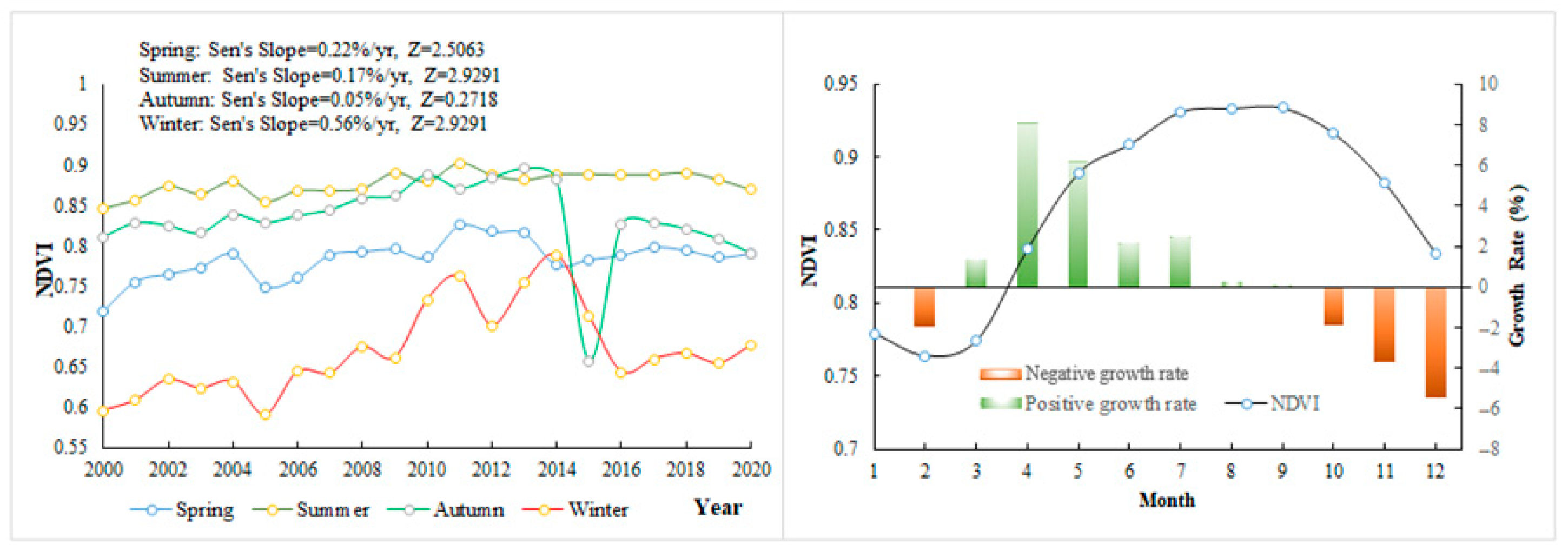 Figure 5 shows the change characteristics of the seasonal average NDVI, with the ranking features of summer (0.8772), autumn (0.8334), spring (0.7833), and winter (0.6698). Throughout the study period, the NDVI increased at rates of ~0.22% per year, ~0.17% per year, ~0.05% per year, and ~0.56% per year in spring, summer, autumn, and winter, respectively (Figure 5). The monthly average NDVI ranged from 0.7638 to 0.9338, and, consistent with the features of seasonal changes, the NDVI was relatively high during the rainy season (from May to October), with the highest value of 0.9338 appearing in September. Contrarily, a low NDVI was observed during the dry season (November–April), with the lowest value of 0.7638 in February.
