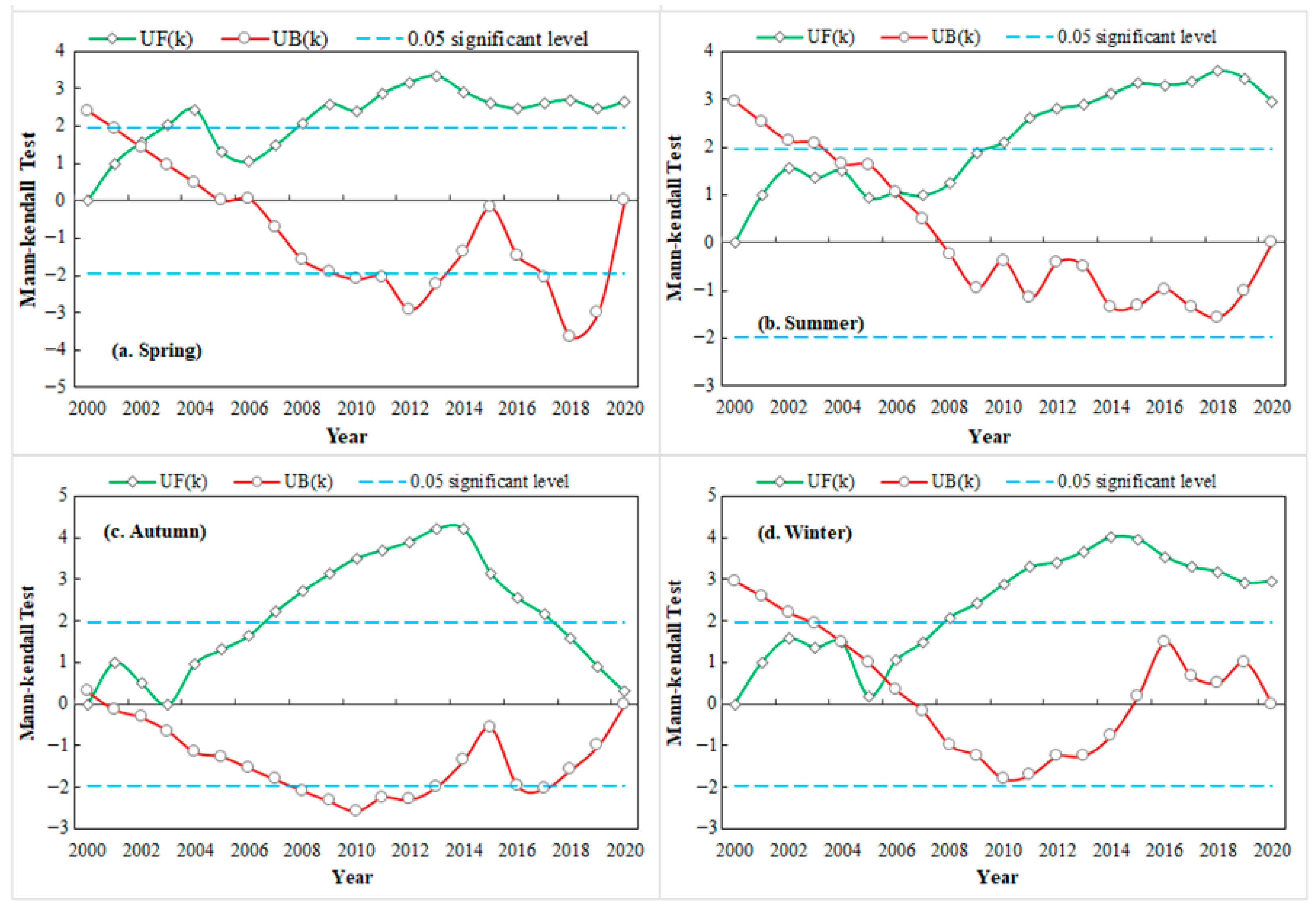 Figure 6. Mann–Kendall mutation test of average monthly NDVI in spring (a), summer (b), autumn (c), and winter (d). The blue dash line represents the critical value at significance level of 0.05 (±1.96). UF(k) and UB(k) mean forward time series statistics and reserve sequence statistics, respectively.