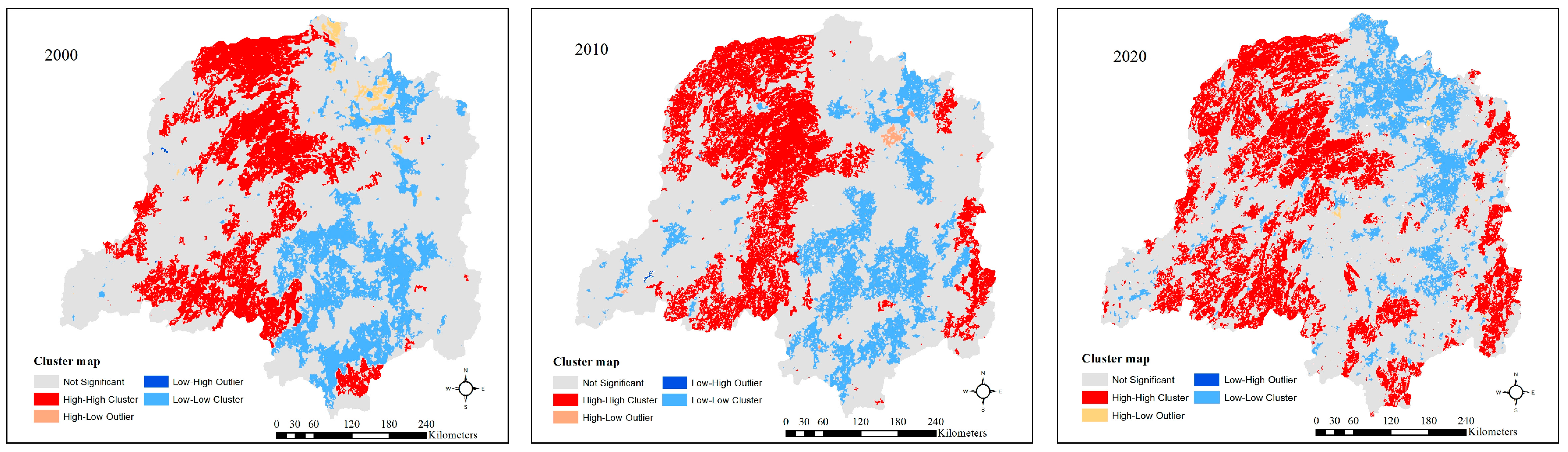 The spatial autocorrelation analysis was utilized to investigate the spatial distribution patterns of vegetation coverage in the DLB. Using ArcGIS 10.3, spatial heterogeneity and spatial clustering characteristics of vegetation coverage in 2000, 2010, and 2020 were analyzed, respectively. Through the local indicator of spatial association (LISA) map, five different clusters of vegetation coverage can be identified in the DLB region, namely High–High (HH), High–Low (HL), Low–High (LH), Low–Low (LL), and not significant [48].