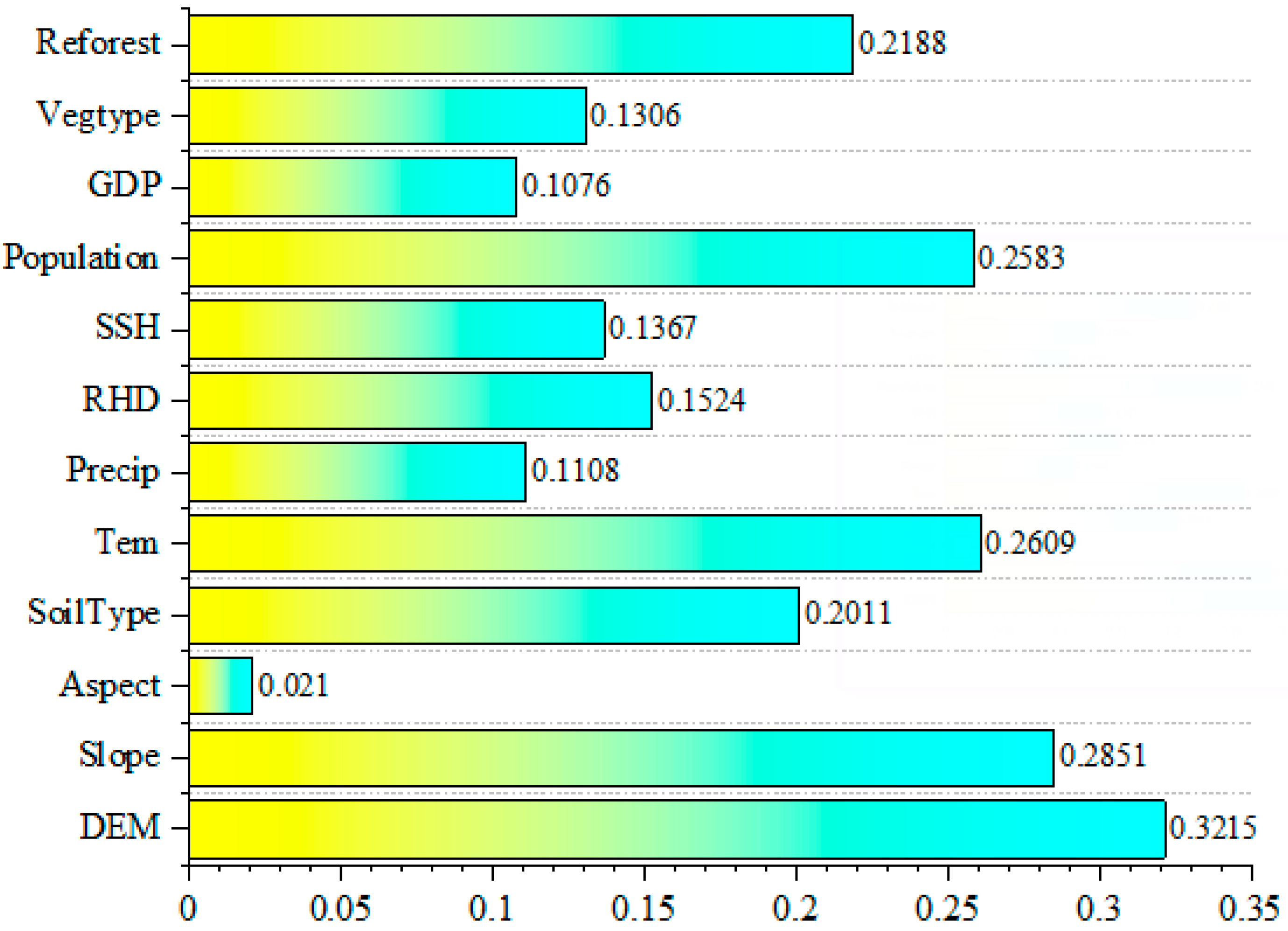 As NDVI change is a comprehensive process influenced by several factors, 12 indicators were chosen from aspects of climate, topographical features, human activity, and soil and vegetation types. The climate data included annual precipitation, mean temperature, sunshine hours, and relative humidity, which were obtained based on daily observation data from meteorological stations across the region (http://data.cma.cn (accessed on 12 December 2024)). Then, the ANUSPLIN interpolation method was applied to interpolate the meteorological data at a spatial resolution of 500 m, setting the 250m digital elevation models (DEMs) as co-variables. Elevation, aspect, and slope were calculated using ArcGIS 10.3 based on a digital elevation model with 250 m resolution freely downloaded from the Geospatial Data Cloud (http://www.gscloud.cn/ (accessed on 12 December 2024)). The soil and vegetation type data with a 1 km resolution were obtained from the Resource and Environmental Science Data Platform (https://www.resdc.cn/data.aspx (accessed on 15 December 2024)). The population density, GDP per capita, and reforested area were selected to reflect the intensity of human activity and were acquired from the county-level Chinese Statistical Yearbook.
