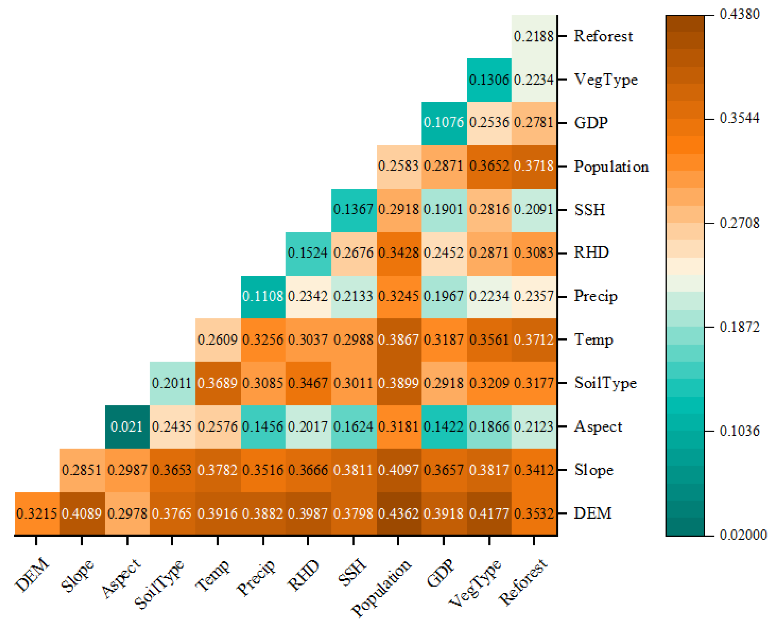 The Geodetector model constituted a suite of statistical tools including factor, interaction, risk, and ecological detectors to investigate the influencing factors and their interaction relation for specific phenomena, and it is an open source model (http://www.GeoDetector.cn/ (accessed on 28 December 2024)). This model considers spatial heterogeneity rather than correlation to detect the impact of multiple factors on vegetation coverage spatial distribution; thus, the multicollinearity among independent variables does not affect the result of the factor detector.