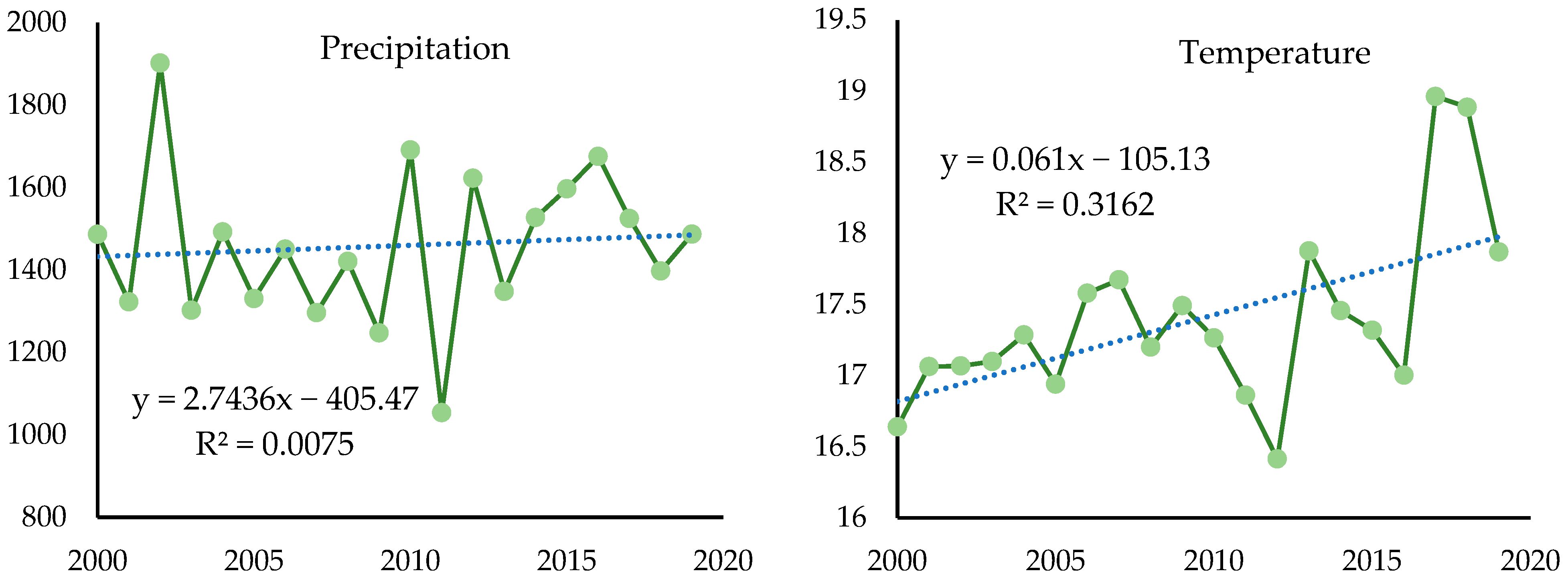 Figure 14. Change trend of precipitation (left) and temperature (right) during 2000 to 2020 in DLB.
