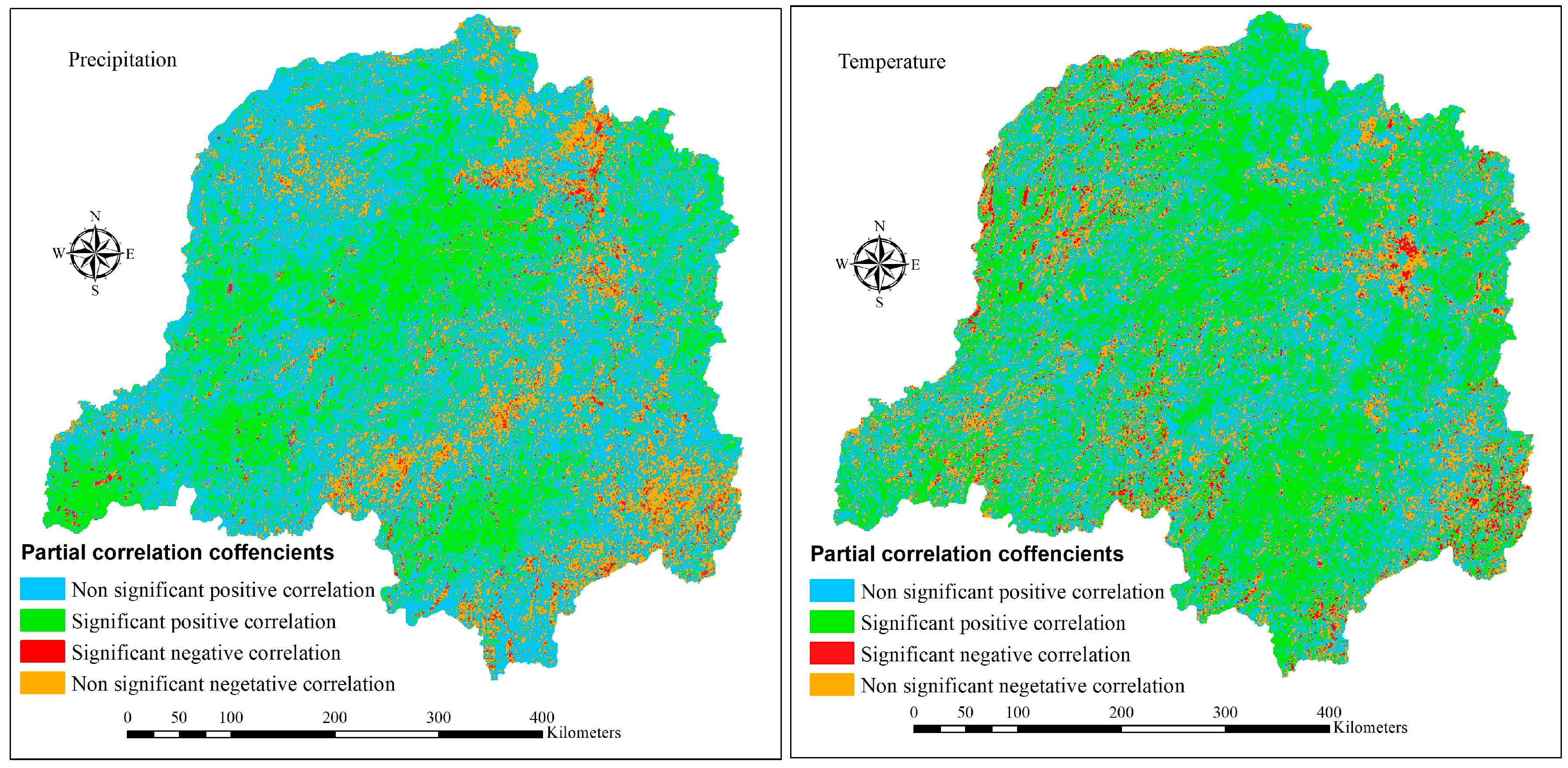 Figure 15. Spatial distribution of the partial correlation coefficients of NDVI with the annual precipitation (left) and annual average temperature (right) in DLB from 2000 to 2020.