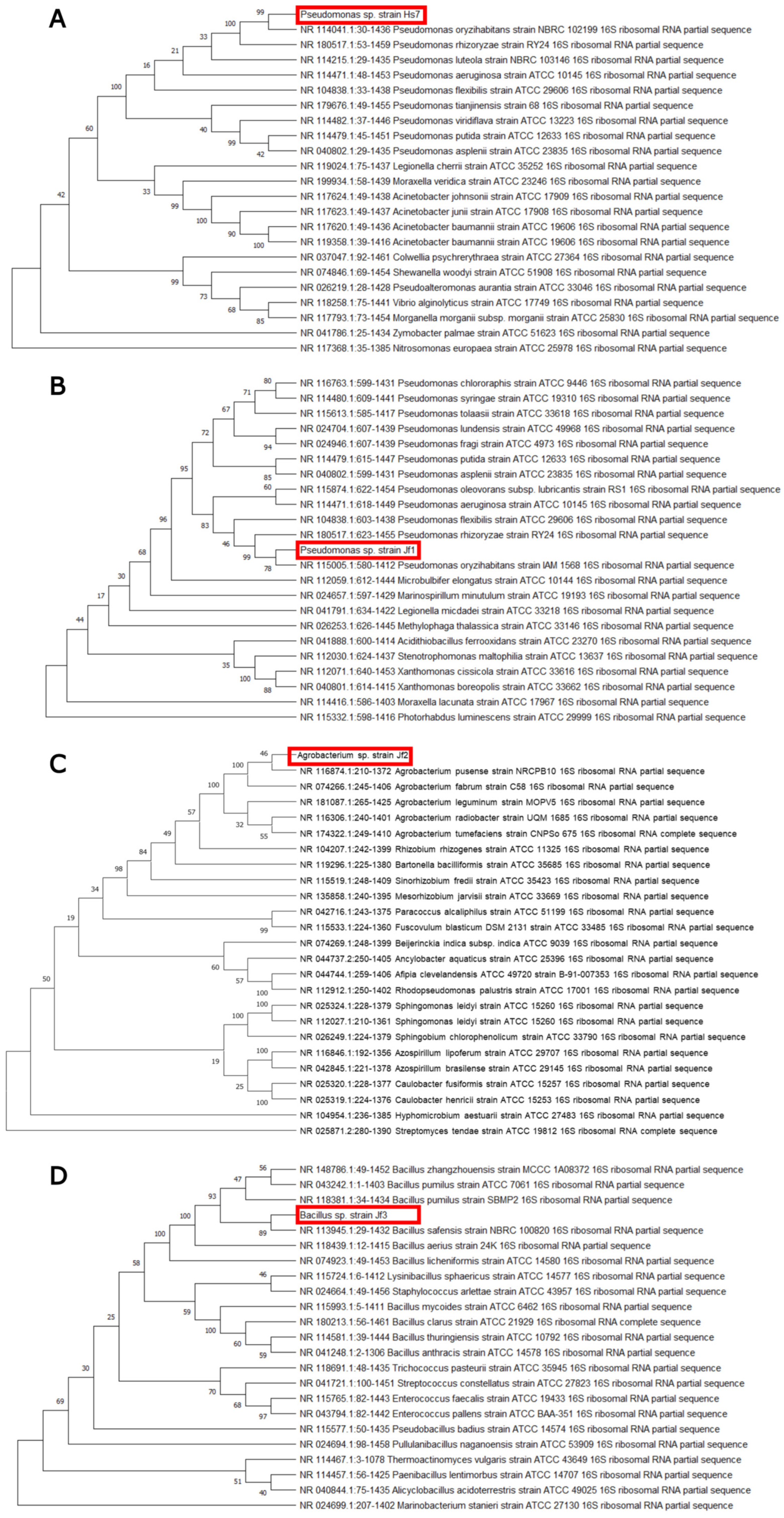 2.4. Assessing Bacterial Isolates: Plant Growth Promotion Assays
