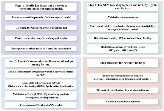 Research workflow for the WenZang database designer-satisfaction study: model development and survey, SEM validation, ANN analysis, and synthesized contributions. Note: the workflow proceeds as follows: hypotheses and the conceptual model are developed; the questionnaire is designed and pretested; formal data are collected and screened with descriptive and normality checks; measurement validity is established and hypotheses are tested via SEM; an ANN is then trained on SEM-derived latent scores with a train/test split, followed by model validation and importance/sensitivity analyses, and results are compared with SEM. Finally, outputs synthesize recommendations to improve designer satisfaction with digital cultural heritage and articulate the study’s theoretical and practical contributions, methods, and conclusions. Abbreviations: SEM = structural equation modeling; ANN = artificial neural network.