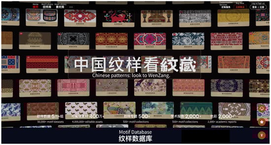 Cultural heritage serves as the foundation of cultural diversity and historical identity, embodying the collective memory and wisdom of human civilizations []. However, this irreplaceable legacy faces unprecedented threats from multiple sources: armed conflicts destroy heritage sites, climate change accelerates artifact deterioration, globalization leads to cultural assimilation, and population displacement disrupts the transmission of intangible heritage []. In response to these challenges, UNESCO has established a comprehensive protection framework []. Yet traditional physical preservation approaches prove insufficient for long-term sustainability. Therefore, digital technologies, offering preservation through digitization, universal accessibility transcending geographical boundaries, and innovative pathways for cultural transmission [,,]. Since the 1990s, leading institutions, including the Louvre [], the British Museum [], and China’s Palace Museum [], have established digital archives, marking a paradigm shift from physical conservation to digital preservation and creative reactivation []. Within this context, the WenZang database https://www.wenzang.cn/) exemplifies this digital transformation approach, integrating digitization, digital preservation, and access, housing over 35,000 digitized Chinese traditional patterns, while enabling contemporary applications through brand collaborations (e.g., Meitu, IKEA), VR/AR experiences, and cultural derivative development [].