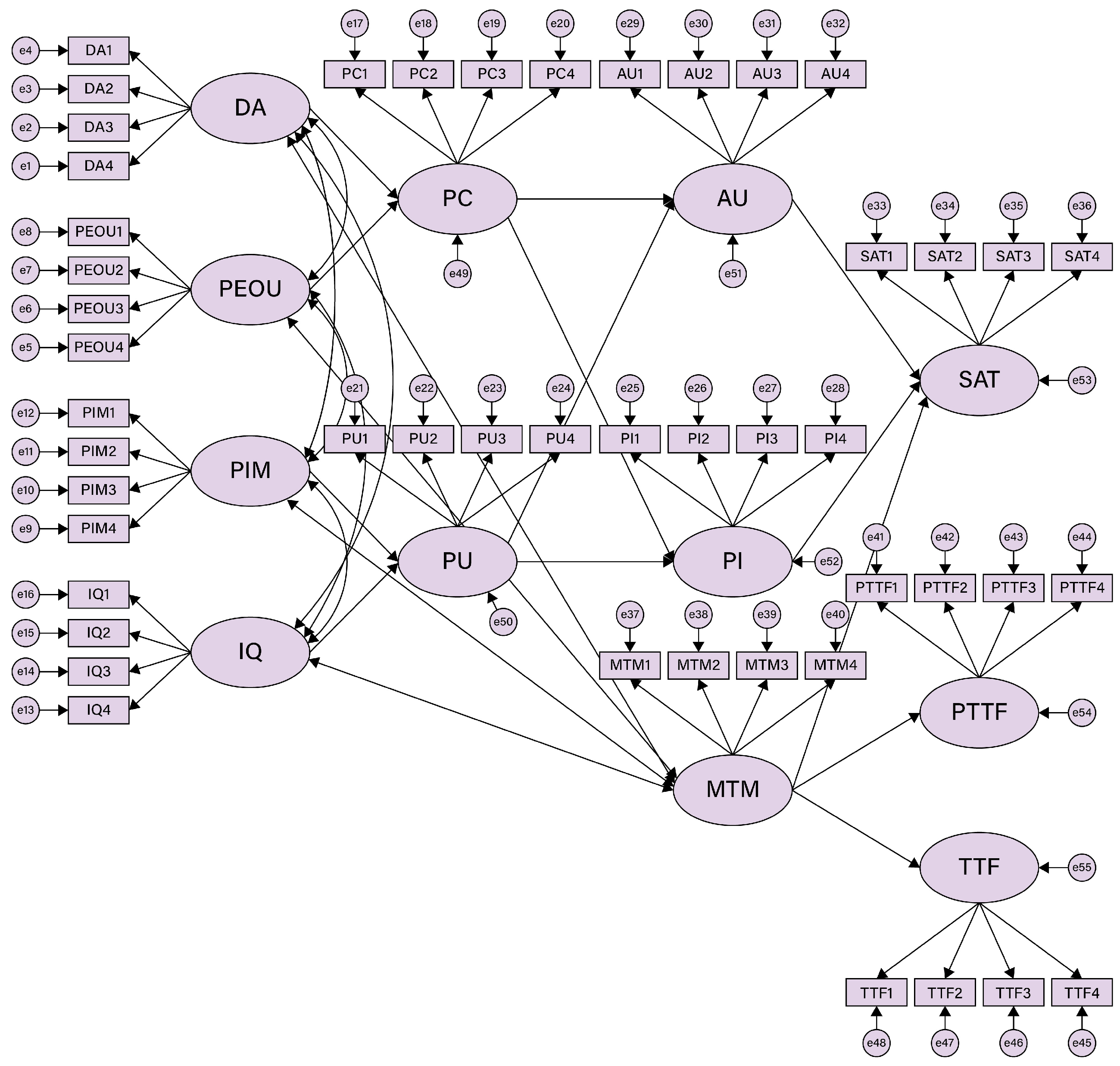 | Variable | DA | PEOU | PC | AU | PIM | IQ | PU | PI | SAT | MTM | PTTF | TTF |