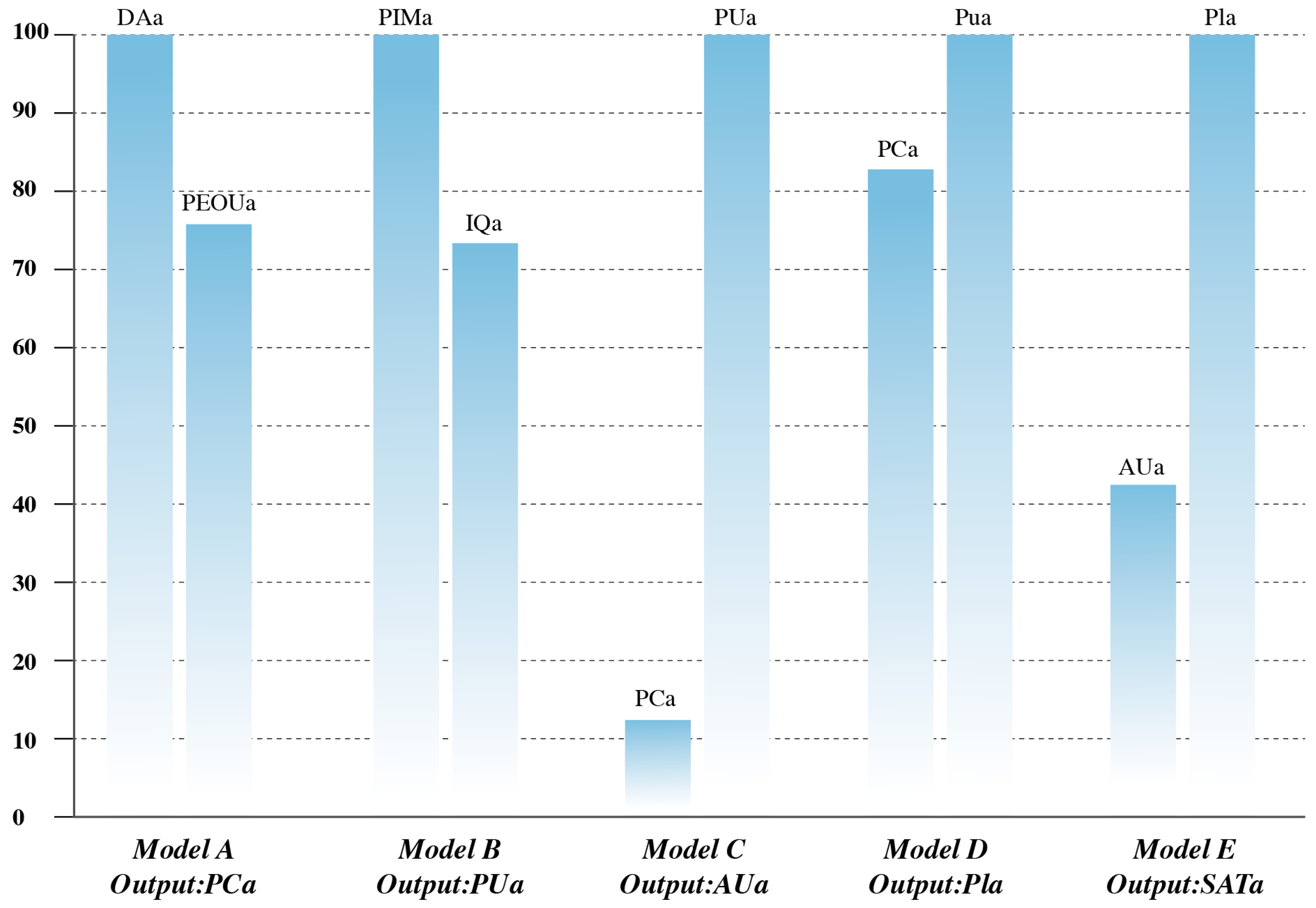 | Input: DAa,PEOUa | Output: PCa | Input: PIMa,IQa | Output: PUa | Input: PCa,PUa | Output: AUa | Input: PCa,PUa | Output: PIa | Input: AUa,PIa | Output: SATa | |