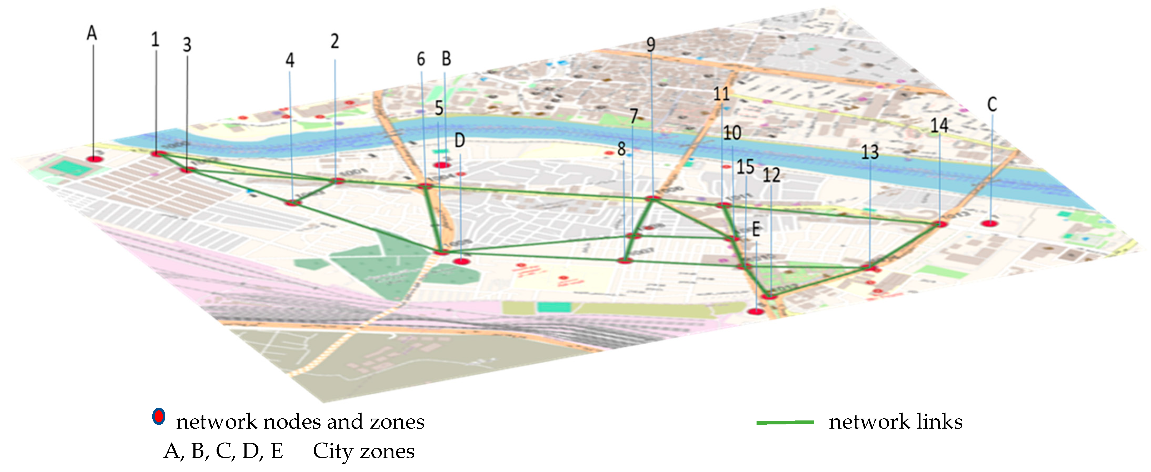 | Number of nodes | 15 | Distance between O–D | Table 1 |