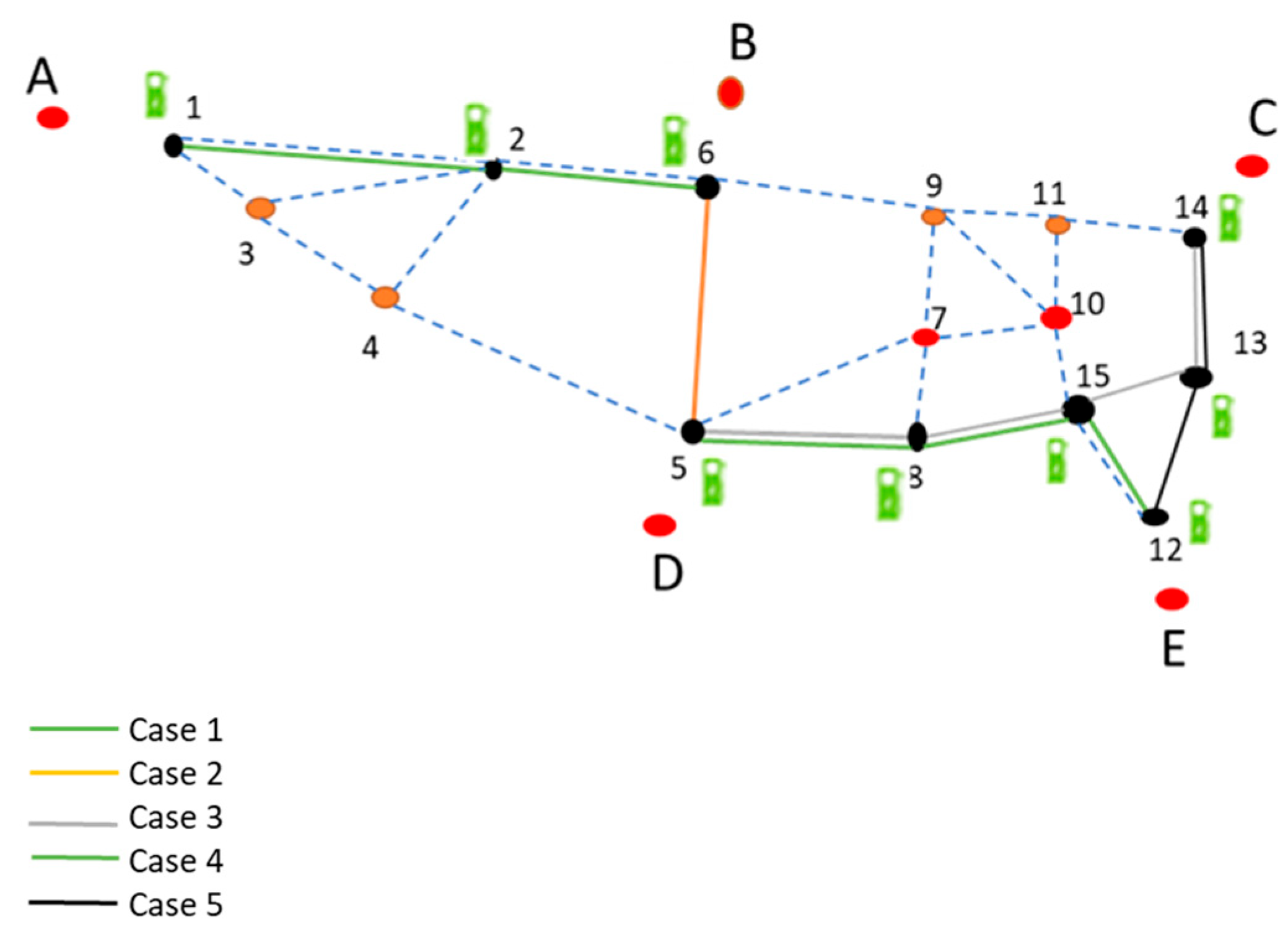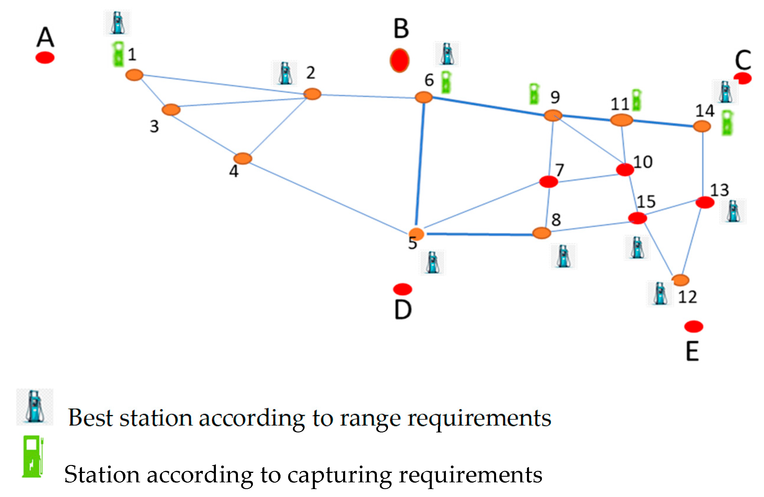 | Suggestion of optimal node locations | 11 | 6 | 1 | 14 | 9 | Nodes where stations should be located | 1 | 2 | 5 | 6 | 8 | 12 | 13 | 14 | 15 |