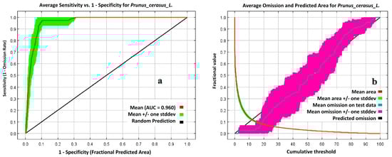 The MaxEnt model exhibited excellent predictive performance, with a mean Area Under the Curve (AUC) of 0.960 ± 0.014 across ten replicate runs (Figure 3a). This high AUC indicates a strong capability to differentiate between suitable and unsuitable habitats for Prunus avium. The omission rate versus predicted area curve (Figure 3b) further validated the model’s reliability, showing minimal divergence between expected and observed omission rates across cumulative thresholds.