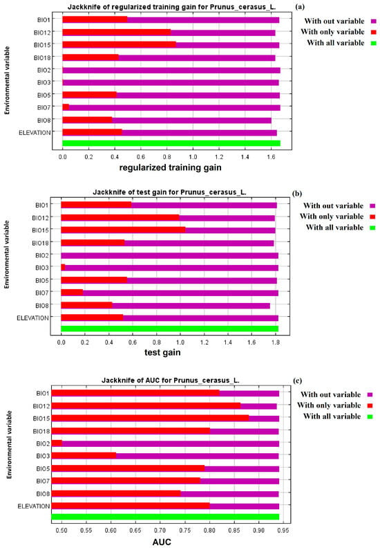 To determine which environmental variables most strongly influenced the distribution of Prunus avium, the built-in Jackknife test in MaxEnt was applied. This method assessed model gain and AUC changes when each variable was excluded or used individually [42,43]. Additionally, the Sum of Percentage Contribution and Permutation Importance (SPCPI) was calculated for each predictor to quantify its relative explanatory power. Variables with SPCPI values exceeding 25% were identified as the primary determinants of the species’ ecological niche [22,44].
