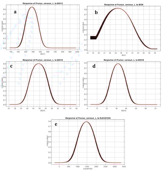 The marginal response curves of the five most influential variables shaping Prunus avium distribution: (a) annual precipitation (BIO12), (b) maximum temperature of warmest month (BIO5), (c) precipitation seasonality (BIO15), (d) and precipitation of warmest quarter (BIO18), (e) Elevation.