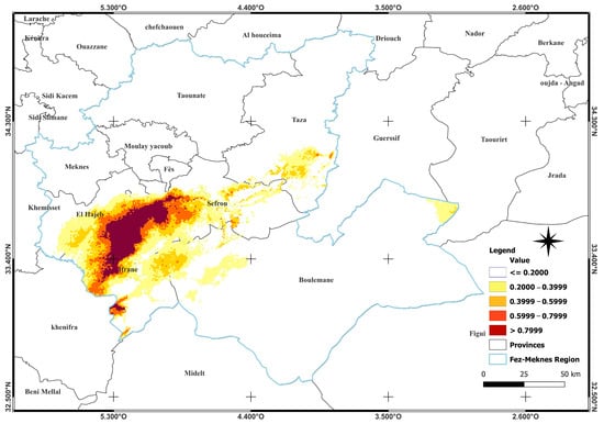 - Highly Suitable Areas (>0.7999 probability): Concentrated in the mountainous provinces of Ifrane, Azrou, El Hajeb, and Sefrou, typically above 1200 m altitude, where precipitation and temperature conditions are optimal.