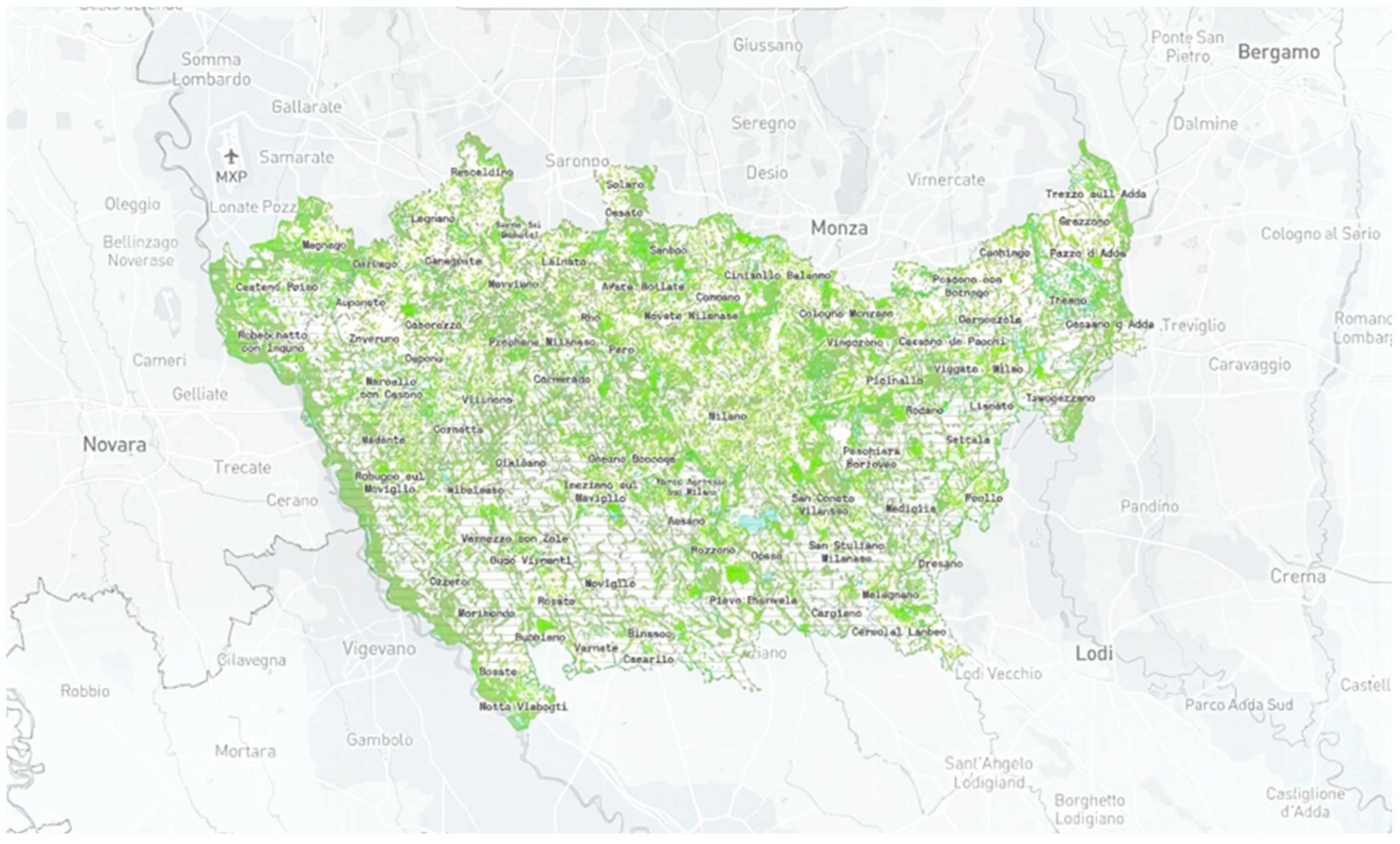 - Peri-urban agricultural landscapes (Parco Agricolo Sud, Parco Nord, Groane) with urban parks and neighborhood open spaces;