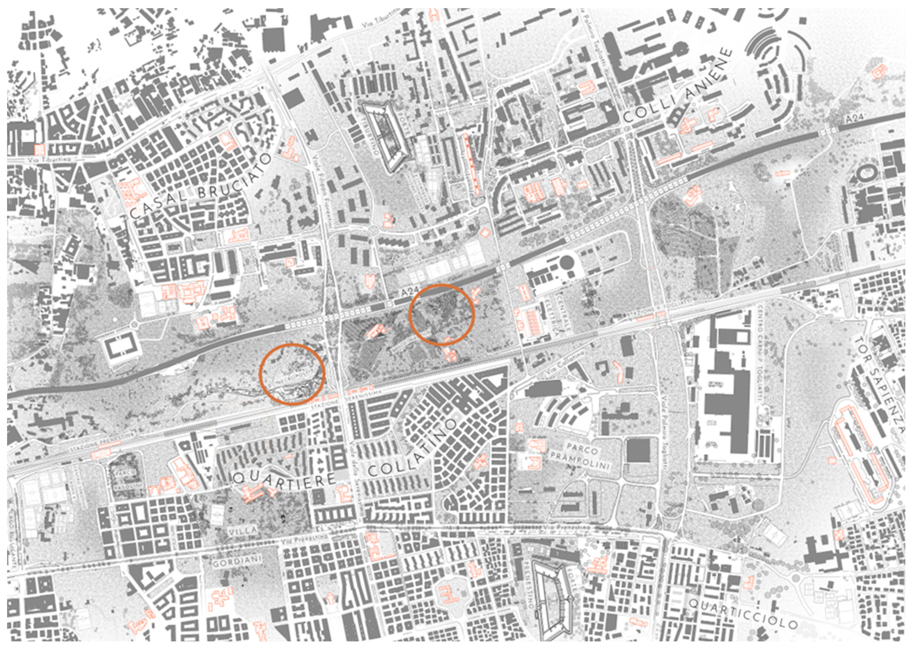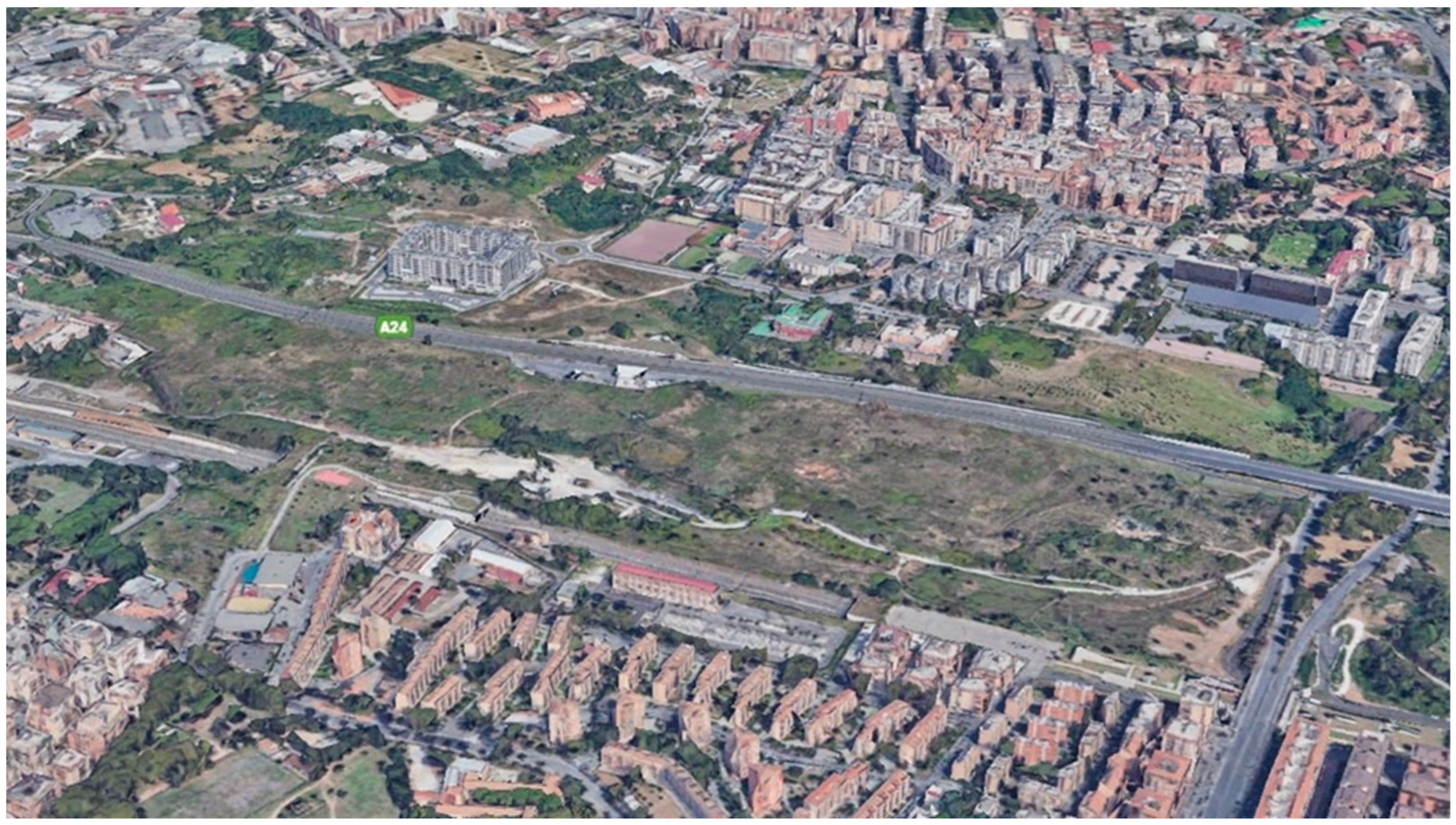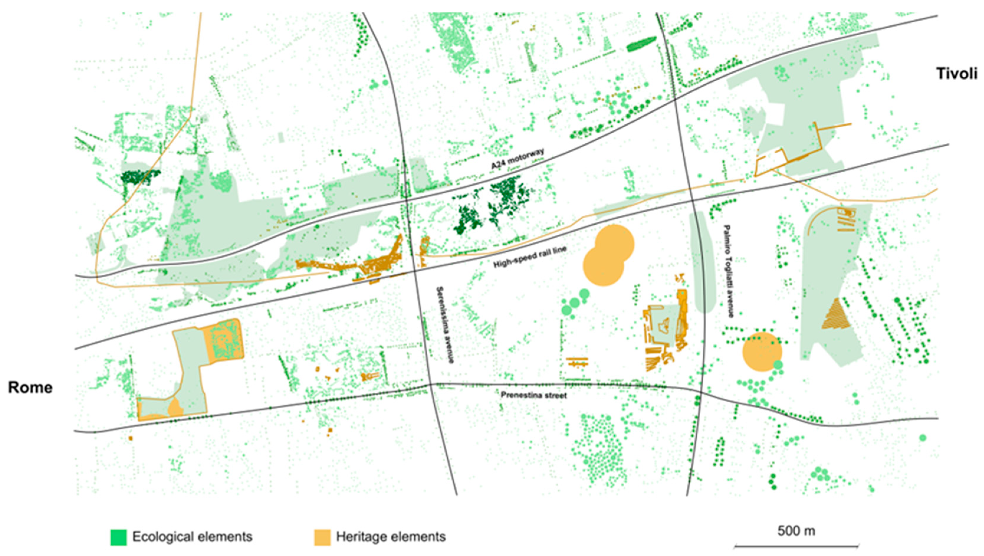 - The need to integrate shaded cycling/walking routes, rail stations as urban nodes, archaeological enhancement (e.g., a large Roman necropolis between Via della Serenissima and Via Basiliano with remains of the ancient Via Collatina, the Aqua Virgo aqueduct, and a votive basin; >2000 tombs and a mausoleum), and attractive public spaces (Figure 12 and Figure 13);
