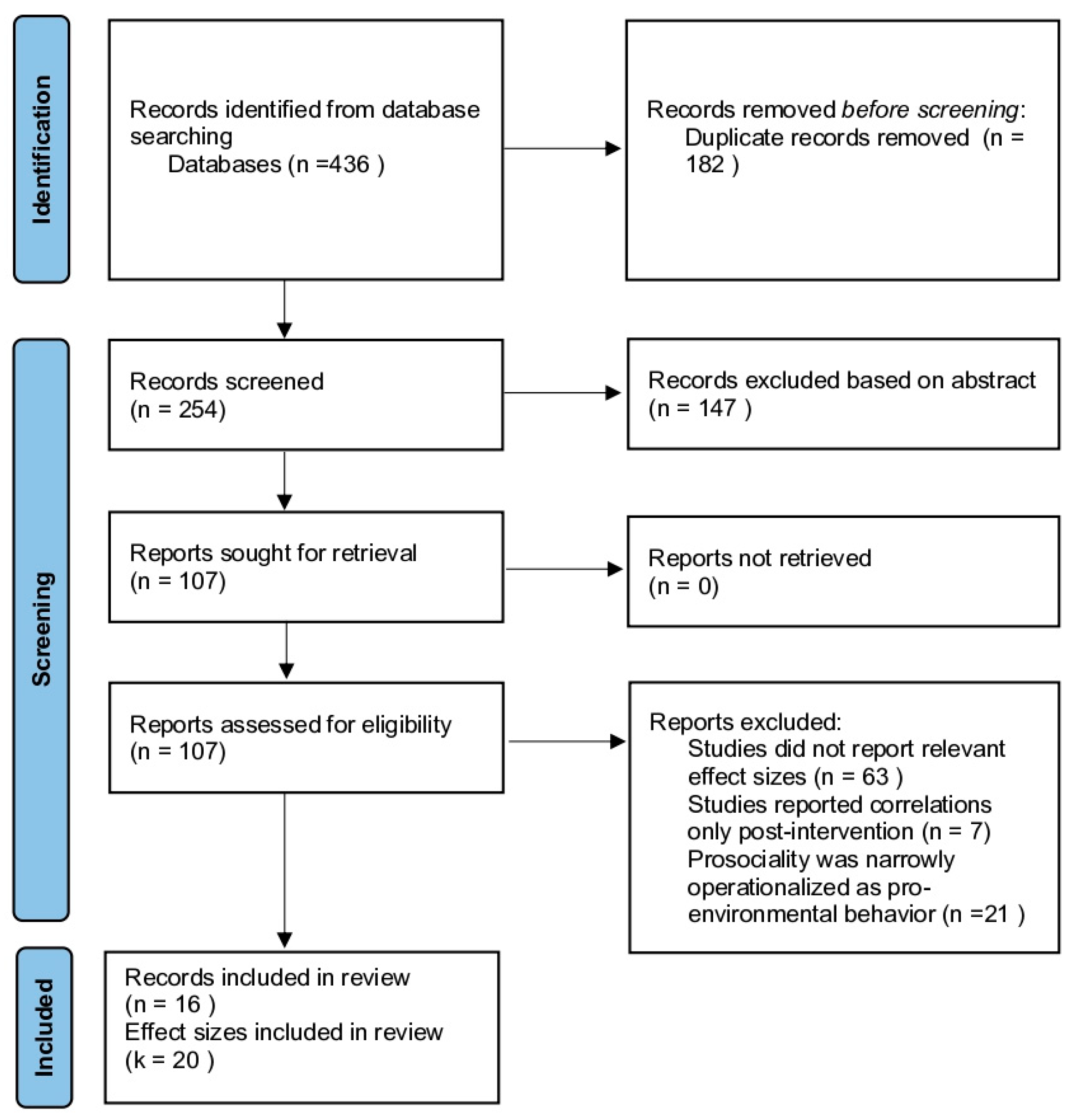 The literature search initially identified 436 records through database searches. After removing 182 duplicate records, 254 unique records were screened based on titles and abstracts. Of these, 147 were excluded for not meeting the inclusion criteria. The remaining 107 reports were retrieved and assessed for eligibility through full-text review. No reports were excluded due to retrieval issues. Following eligibility assessment, 91 reports were excluded for the following reasons: (a) 63 did not report relevant effect sizes, (b) 7 reported correlations only post-intervention, and (c) 21 narrowly operationalized prosociality as pro-environmental behavior rather than human-directed prosociality. Ultimately, 16 reports comprising 20 independent studies met all inclusion criteria and were included in the meta-analysis. A detailed overview of the study selection process is presented in Figure 1.