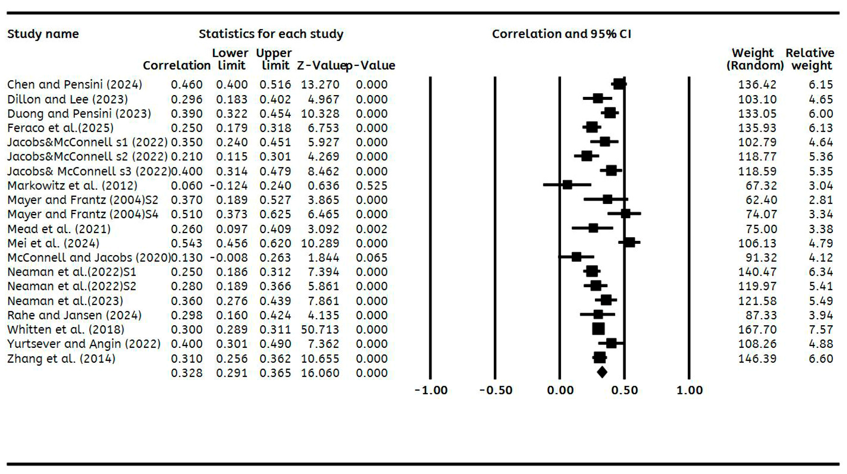 Correlation coefficients were used as the effect size to quantify the relationship between nature connectedness and prosociality. To remove intrastudy bias, only one measure per construct was retained. For natural connectedness, multi-item trait scales with high reliability and broad conceptual coverage (e.g., Connectedness to Nature Scale) were prioritized over single-item indicators (e.g., Inclusion of Nature in Self). For prosociality, behavioral measures were prioritized when available. In their absence, validated prosocial behavior scales (e.g., Altruism Scale) were employed, and when such measures were not reported, related constructs (e.g., empathy, perspective-taking) were considered as proxies. All effect sizes were reported as correlation coefficients in the primary studies. Correlation coefficients were transformed to Fisher’s Z values prior to meta-analysis to stabilize variance, especially as some correlations exceeded 0.30, and were converted back to r for interpretation [71].