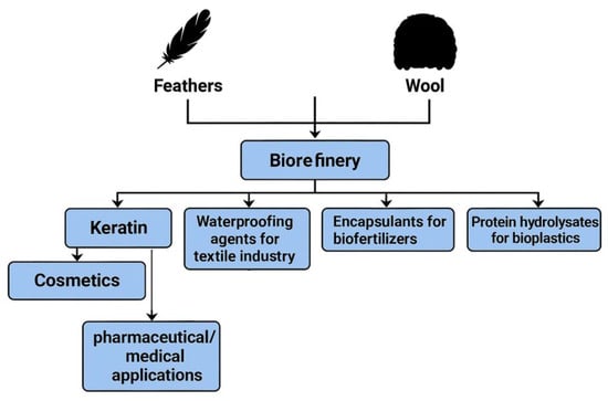 Feathers and wool are protein-rich biomasses. They offer significant potential for conversion into high-value products (Figure 4), such as protein hydrolysates for high-quality feed and fertilizer [,,] and as a soil improver []. However, despite this promising potential, processing facilities for feather and wool waste remain scarce. This is likely due to the high infrastructure costs and low efficiency of current conversion methods [].