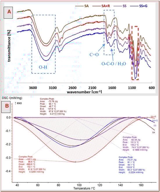 The DSC curves of all the starch materials obtained have a similar pattern (Figure 2B). All of them show a wide endothermic phase transition, starting at a low temperature of about 40 °C and ending above 130 °C. The minimum of the endothermic peak is within the range of 90–101 °C, and the enthalpy of phase transformation, calculated from its surface, ranges from 62 J/g to 131 J/g. In this temperature range, both the melting of the crystalline fraction of starch and the evaporation of water trapped in its network are known to occur. Its width indicates the presence of starch crystallites of various sizes in the structure of these materials. Depending on the strength of the interaction of trapped water molecules with starch hydroxyl groups and components of both plant extracts, the water molecules gradually evaporate, which additionally induces crystallite melting [].
