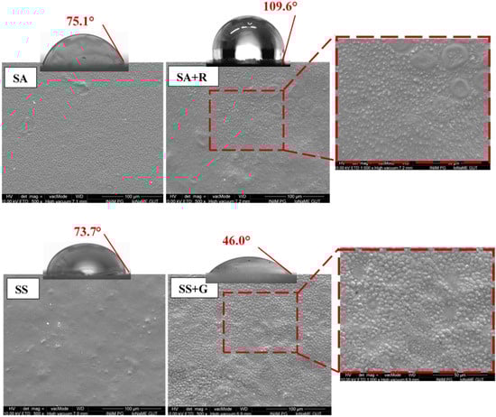 The peaks with the maximum at about 2926 cm−1 and about 2888 cm−1 indicate the H-C stretching of the methyl and methylene groups, respectively, while the observed bands in the region of 1336 cm−1 are related to H-C bending vibrations []. Whereas the peak at 1716 cm−1 indicates the presence of carbonyl groups in citric acid used as a crosslinking agent for native starch. The peak at 1644 cm−1 in starch spectra corresponds to the stretching vibration of O-C-O but also to the bending vibration of the water molecule bundle in starch [,,]. After modification with plant extracts, it moves toward lower wavenumber values of 1636 cm−1 for SA+R and 1633 cm−1 for SS+G, and more importantly, its intensity increased significantly, especially in the case of SS+G. This suggests a high affinity of this film for water. The peak at 1150 cm−1 corresponds to C-O vibrations present in the C-O-H groups, while the peak at 1077 cm−1 corresponds to C-O stretching vibrations in the O-C-O groups.