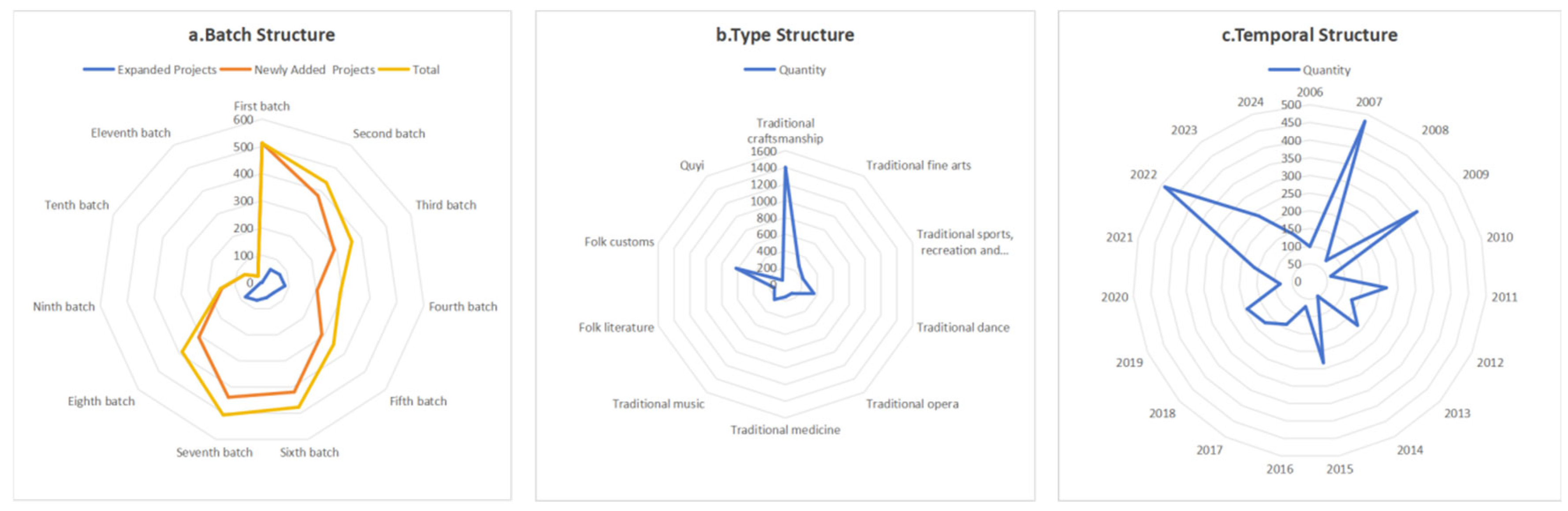 Figure 2a), the largest number of ICH items belongs to the first batch, totaling 512 items and accounting for 14.32% of the total ICH items. This is followed by the seventh batch, with 507 items (14.18%), and the sixth batch, with 477 items (13.34%). Among these, the first batch contributed the highest number of newly added items, while the fourth batch contained the most expanded items.