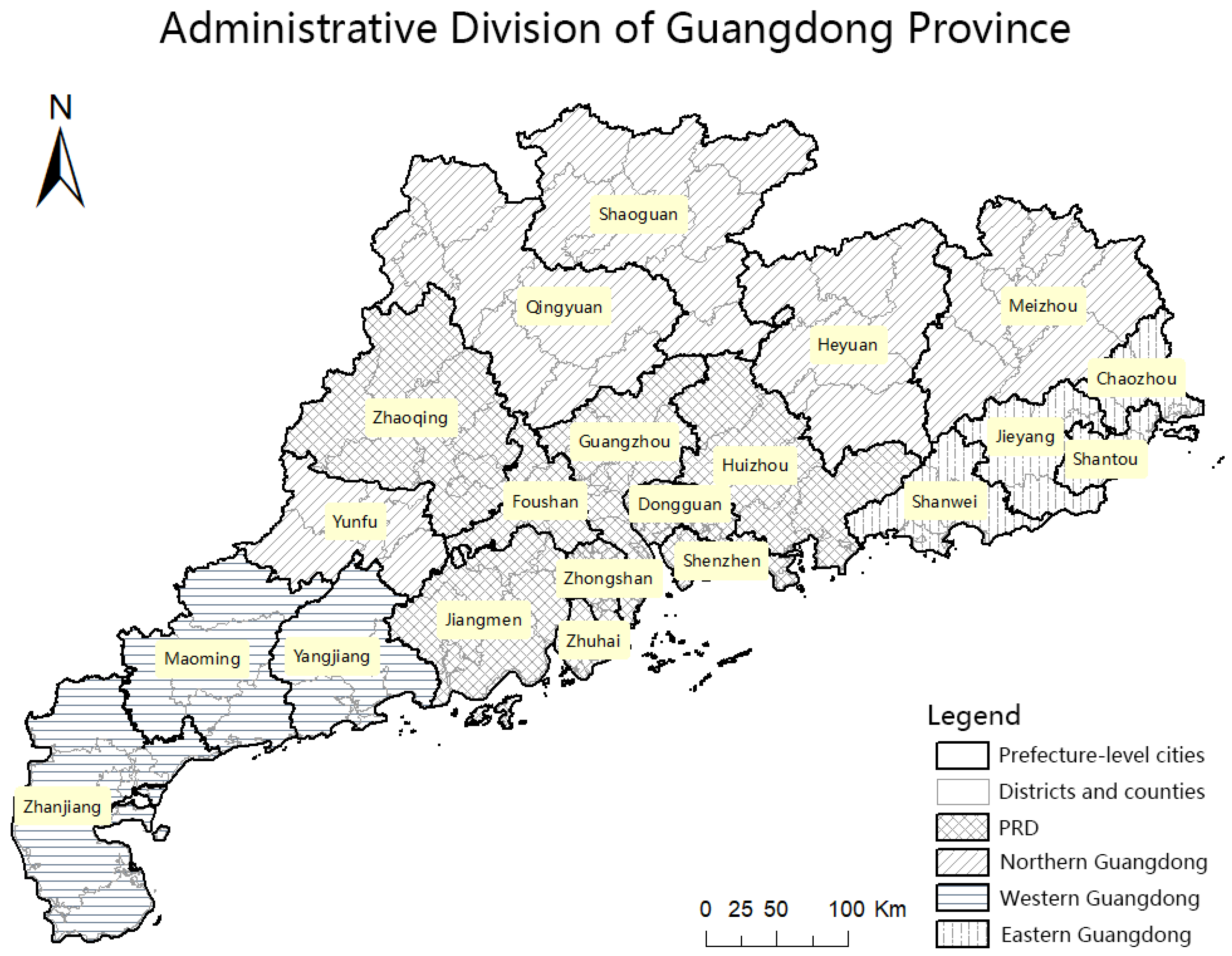 40]. The PRD includes nine cities: Guangzhou, Shenzhen, Foshan, Dongguan, Zhongshan, Zhuhai, Zhaoqing, Jiangmen, and Huizhou. Eastern Guangdong comprises four cities: Chaozhou, Shantou, Jieyang, and Shanwei. Western Guangdong includes three cities: Zhanjiang, Maoming, and Yangjiang. Northern Guangdong consists of five cities: Yunfu, Qingyuan, Shaoguan, Heyuan, and Meizhou (administrative division of Guangdong Province shown in