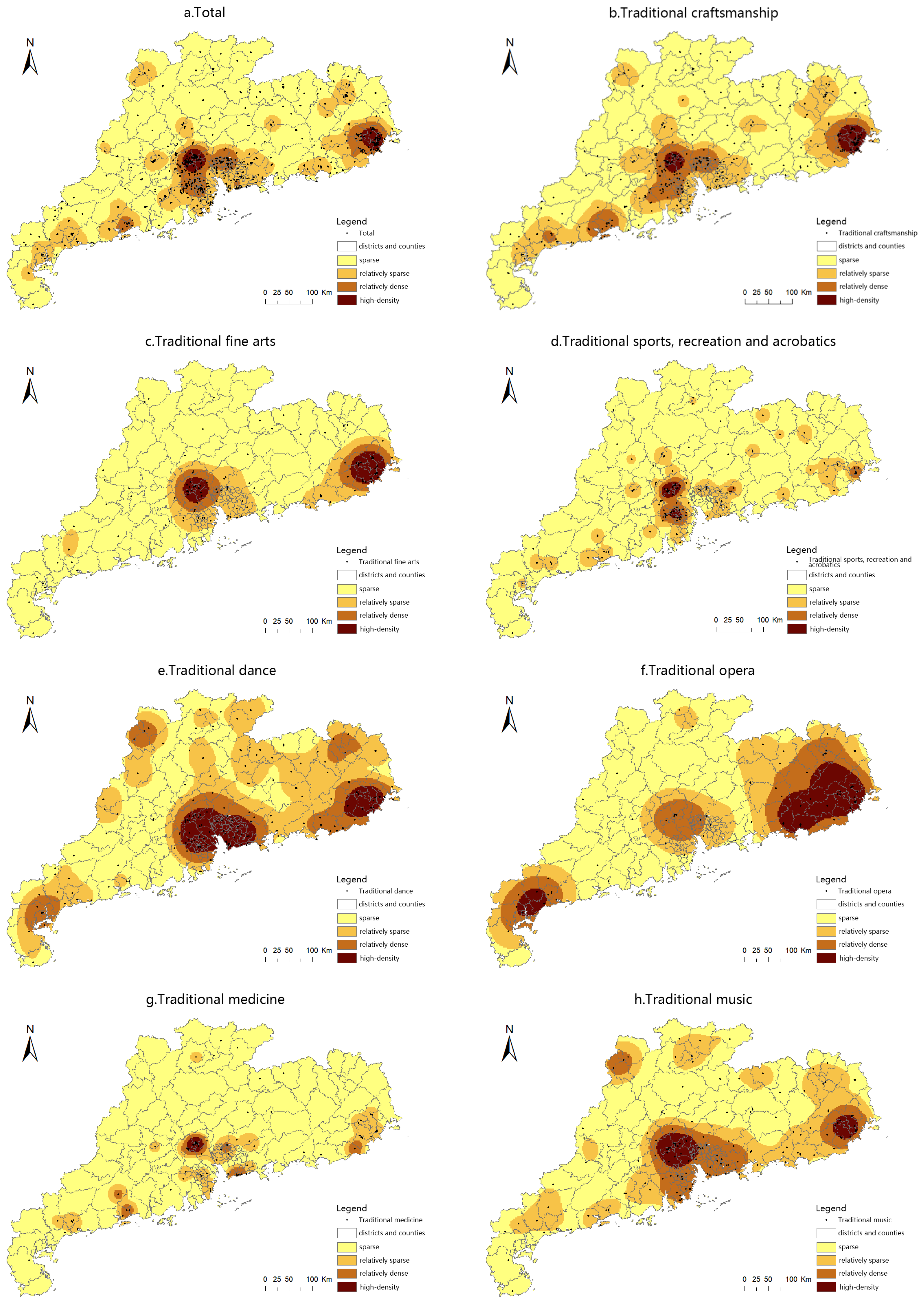 A kernel density analysis was conducted on all ICH items in Guangdong Province, categorizing the core density zones into four levels: high-density, relatively dense, relatively sparse, and sparse zones. As for the amount of ICH items, among the 21 prefecture-level cities in Guangdong, Guangzhou, Jieyang, and Dongguan ranked highest in total ICH items, while Yunfu, Zhuhai, and Zhaoqing had the fewest. The kernel density analysis covered 182 county/districts (excluding Shenzhen’s Guangming District, Zhongshan’s Dongsheng Town, and Dongguan’s Ecological Park due to data unavailability, resulting in 179 valid ones).