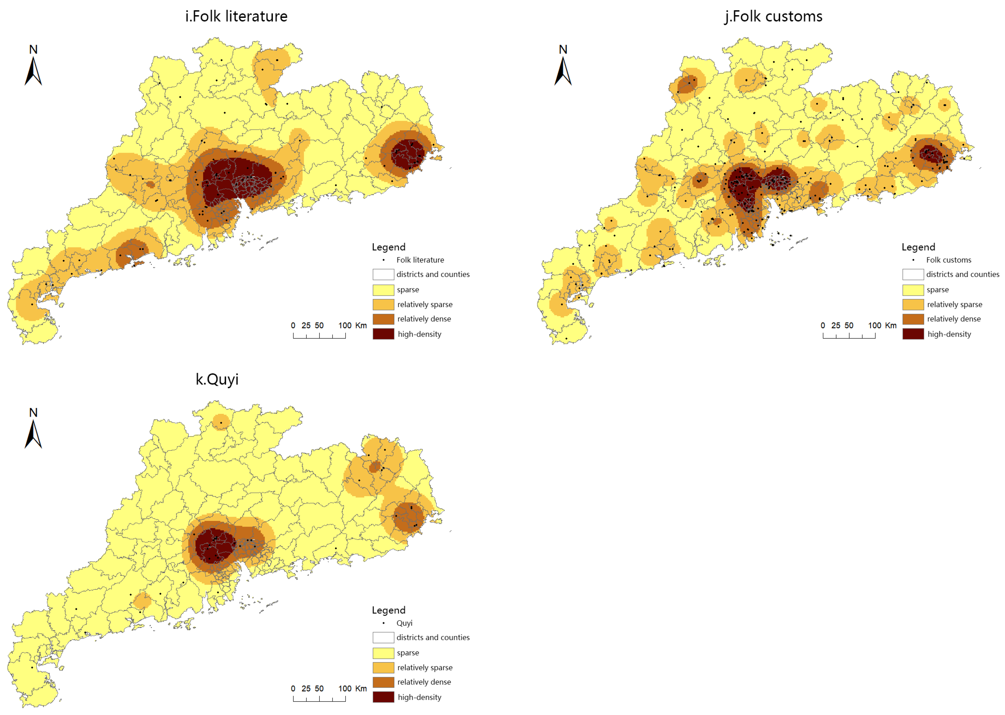 Folk literature ICH, comprising oral literary works created and transmitted by the masses through long-term social practice, has high-density zones in the PRD and Eastern Guangdong, with relatively dense areas also found in Western Guangdong.
