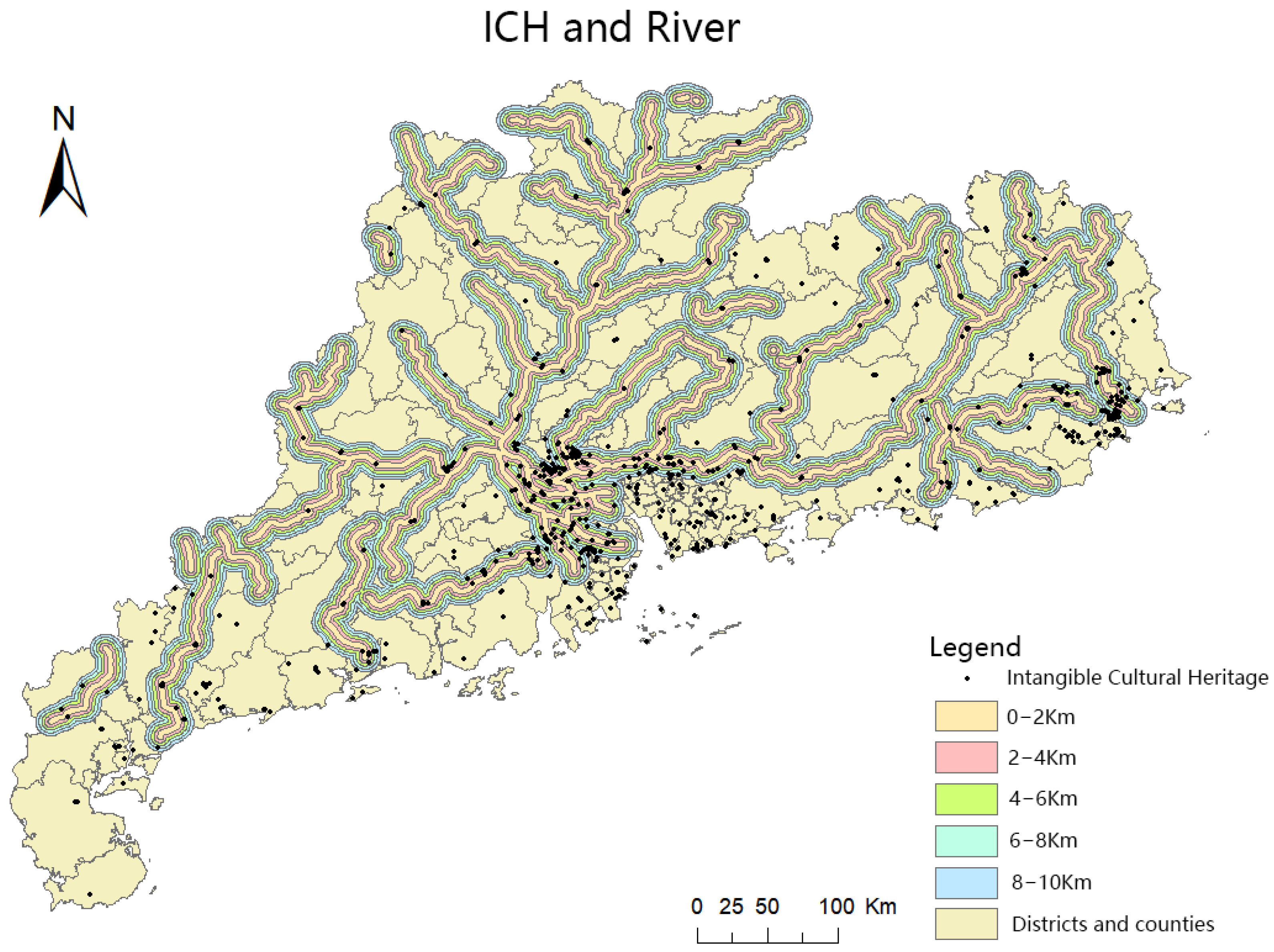 Analysis of the relationship between ICH and major rivers reveals that rivers, as the cradle of human civilization, have profoundly influenced human development. ICH items correspondingly exhibit a characteristic distribution along river systems. Buffer zone analysis was conducted for rivers in Guangdong Province using radii of 2 km, 4 km, 6 km, 8 km, and 10 km, calculating the amount of ICH items within each buffer zone. The results (displayed in