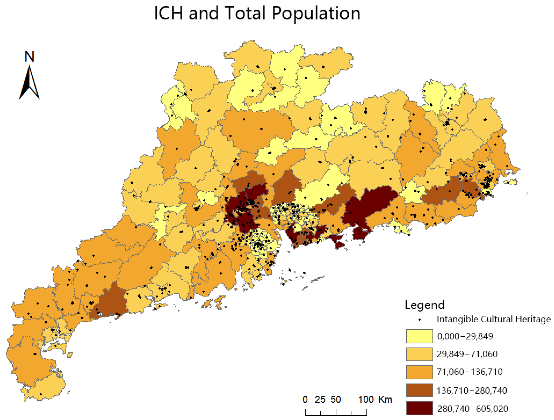 Regional population size both determines the potential audience for ICH transmission and influences the spatial distribution of heritage items. Observing Guangdong’s four major regions reveals two clear population flow trends (