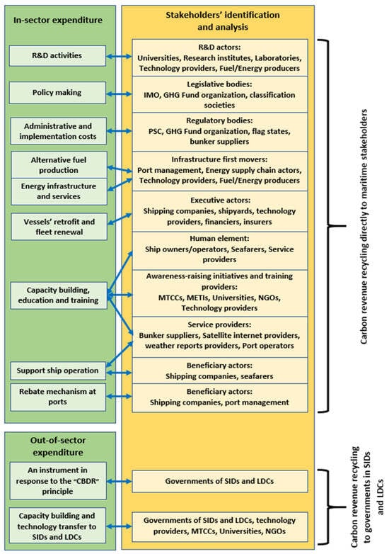 This study advocates for a balanced public–private distribution network for the recycling of carbon revenue (see Figure 2). In this approach, with no interference by governments, revenue is directly allocated to major maritime stakeholders who have shown significant commitment and investment in shipping decarbonization. Conversely, in SIDs and LDCs, where maritime stakeholders are not the primary actors, carbon revenues may be redirected to the governments of these nations. This approach requires a comprehensive analysis of stakeholders, including investigation of their interests, potential, and interactions. Furthermore, as shown in Figure 2, it is feasible to connect the stakeholder analysis to the areas where carbon revenues could be effectively utilized. A balanced public–private distribution scheme, as proposed in this study, by incorporating a well-designed monitoring mechanism can enhance post-distribution transparency and eliminate bureaucratic inefficiencies between governments and executive stakeholders.