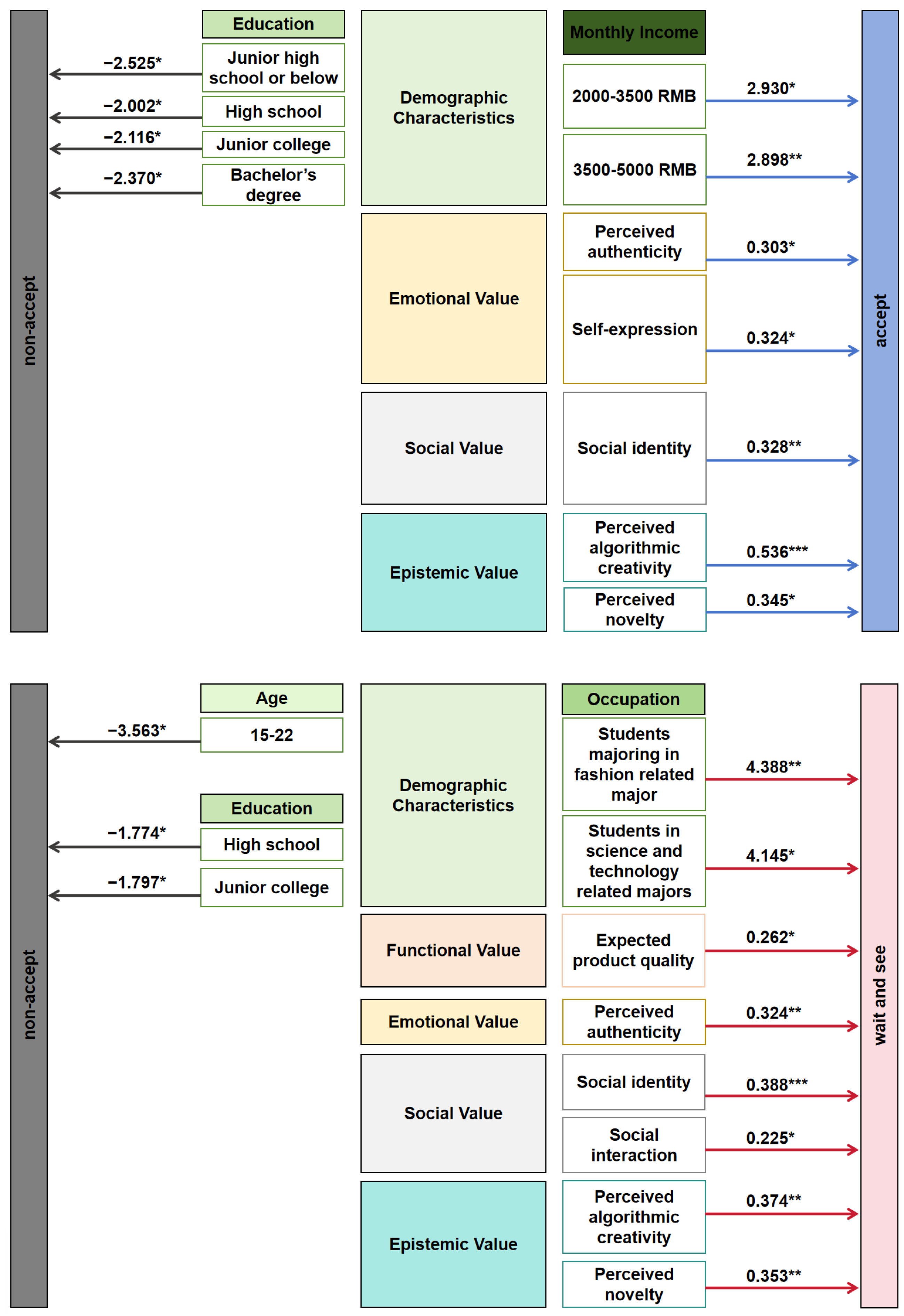 - Huang, X.; Liu, C.; Wang, J.; Zheng, J. Exploring Chinese Millennials’ Purchase Intentions for Clothing with AI-Generated Patterns from Premium Fashion Brands: An Integration of the Theory of Planned Behavior and Perceived Value Perspective. J. Theor. Appl. Electron. Commer. Res. 2025, 20, 141. [Google Scholar] [CrossRef]