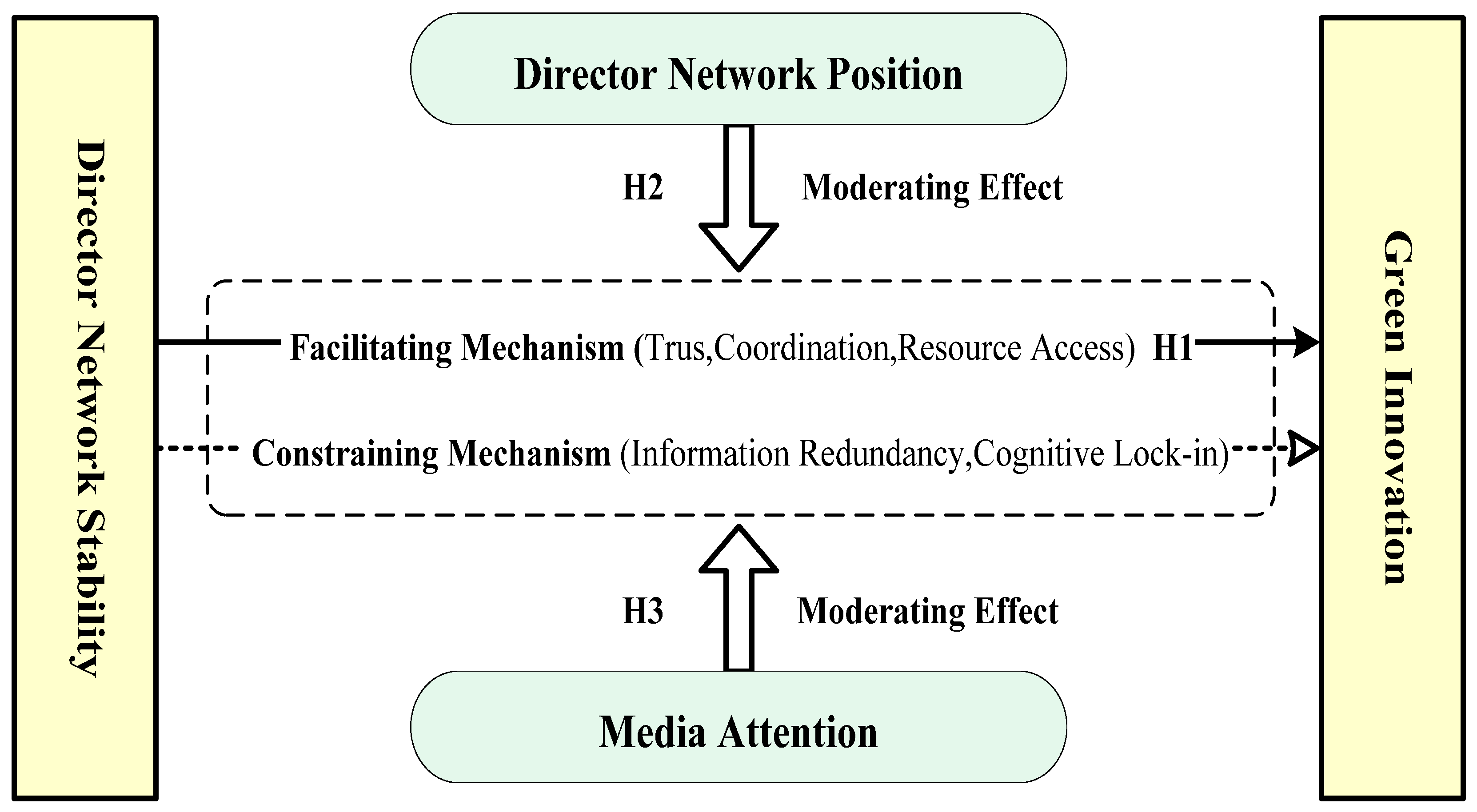 On the other hand, from the perspective of relational embeddedness, long-term stable relationships cultivate trust and cooperation, which play a crucial role in fostering green innovation. A long-term stable director network not only signals close cooperation among firms but also provides substantial informational and resource advantages in the process of green innovation. First, stability implies the existence of strong and trusted ties between firms and their partners. Such ties are typically associated with frequent communication, deep cooperation, and shared values, enabling firms to access greater social capital [45]. On the basis of trust and reciprocity, firms are more willing to share critical green technologies and managerial practices, thereby obtaining high-quality information and knowledge more efficiently [46]. Timely access to such high-quality knowledge is vital for green innovation, as it supports firms in maintaining a competitive edge in technological R&D and the strategic deployment of green projects [47]. Second, long-term stable partnerships can significantly reduce transaction and coordination costs associated with repeated contracting and bidding [48]. They also generate economies of scale and lower the costs of information collection and verification for each transaction [49]. As a result, firms can allocate more financial and managerial resources to green innovation activities, thereby enhancing both the quantity and speed of green innovation outputs. Third, the trust mechanisms embedded in strong and stable relationships effectively suppress opportunism and moral hazard [50]. In stable cooperative networks, firms that violate established norms risk losing important partners and substantial orders, imposing high penalties on opportunistic behavior. Such constraints ensure the longevity and regularity of cooperation. For green innovation, this means lower uncertainty and smoother collaboration in the transfer of resources and technologies, ensuring the efficient flow of green resources and knowledge across firms [51]. Finally, from both the “quantity” and “quality” dimensions of green innovation, director network stability not only provides firms with continuous and reliable sources of information and knowledge but also creates a stable external environment by reducing transaction costs and uncertainties. This environment enables firms to accelerate green technology development and diffusion while ensuring that innovation outcomes carry higher market value and sustainability.