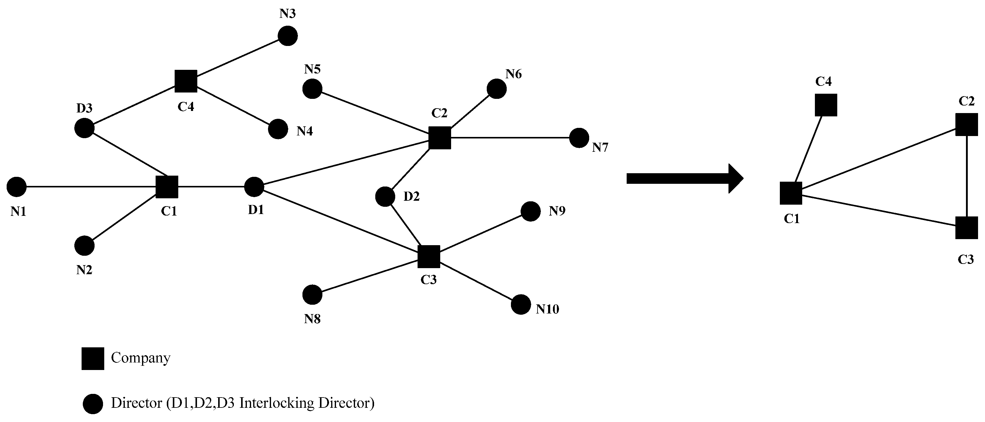 The independent variable in this study is the stability of the director network (Stab). First, information on directors’ appointments in listed companies was obtained from the CSMAR and WIND databases. Using company codes and director IDs, a “company–director” two-mode matrix was constructed. Following prior studies [74,75,76], the two-mode projection method in social network analysis was applied to convert the company–director two-mode network into a company–company one-mode network (as shown in Figure 2).