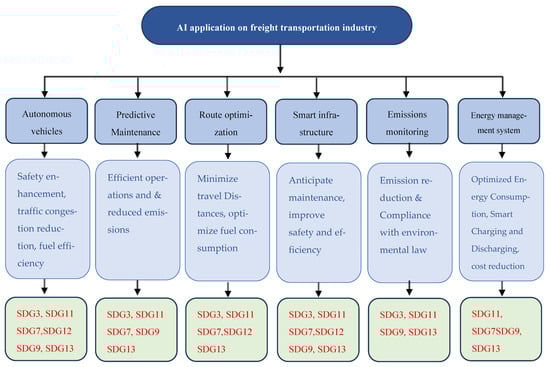 AI-driven innovations are transforming energy management within the freight sector by enabling intelligent grids, predictive optimization, and greater integration of renewable sources. These advancements not only enhance energy efficiency and lower emissions but also promote sustainable industrial development, thereby supporting SDGs 7 (Clean Energy), 9 (Industry and Innovation), 11 (Sustainable Cities), and 13 (Climate Action) [63]. Furthermore, AI plays a crucial role in facilitating the transition toward electric and hydrogen-powered freight vehicles, contributing to reduced emissions, efficient use of resources, and lower operational energy costs [64]. Beyond operational efficiency, AI applications also strengthen climate resilience by improving environmental forecasting, advancing clean energy technologies, and optimizing resource management for mitigation and disaster response efforts [64].