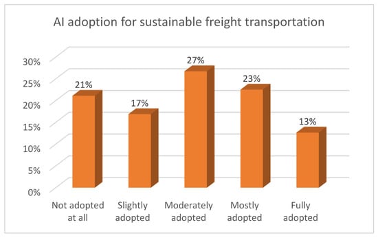 The survey’s results are organized into four sections. Section 5.2.1 examines the level of AI adoption by freight transportation industries in Morocco to enhance their sustainability. Section 5.2.2 is related to AI effectiveness and its influence on operations and sustainability. Section 5.2.3 reviews carbon tracking and reporting practices in the freight transport industry. Section 5.2.4 describes the challenges and opportunities encountered along the way toward carbon neutrality.
