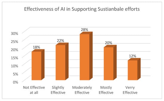The majority of companies confirmed the significant impact of AI adoption on enhancing sustainable initiatives, with about 28% evaluating AI as moderately effective and 20% as mostly effective. In contrast, only 12% assessed AI as highly effective, while 18% reported it had no effectiveness at all (Figure 4).