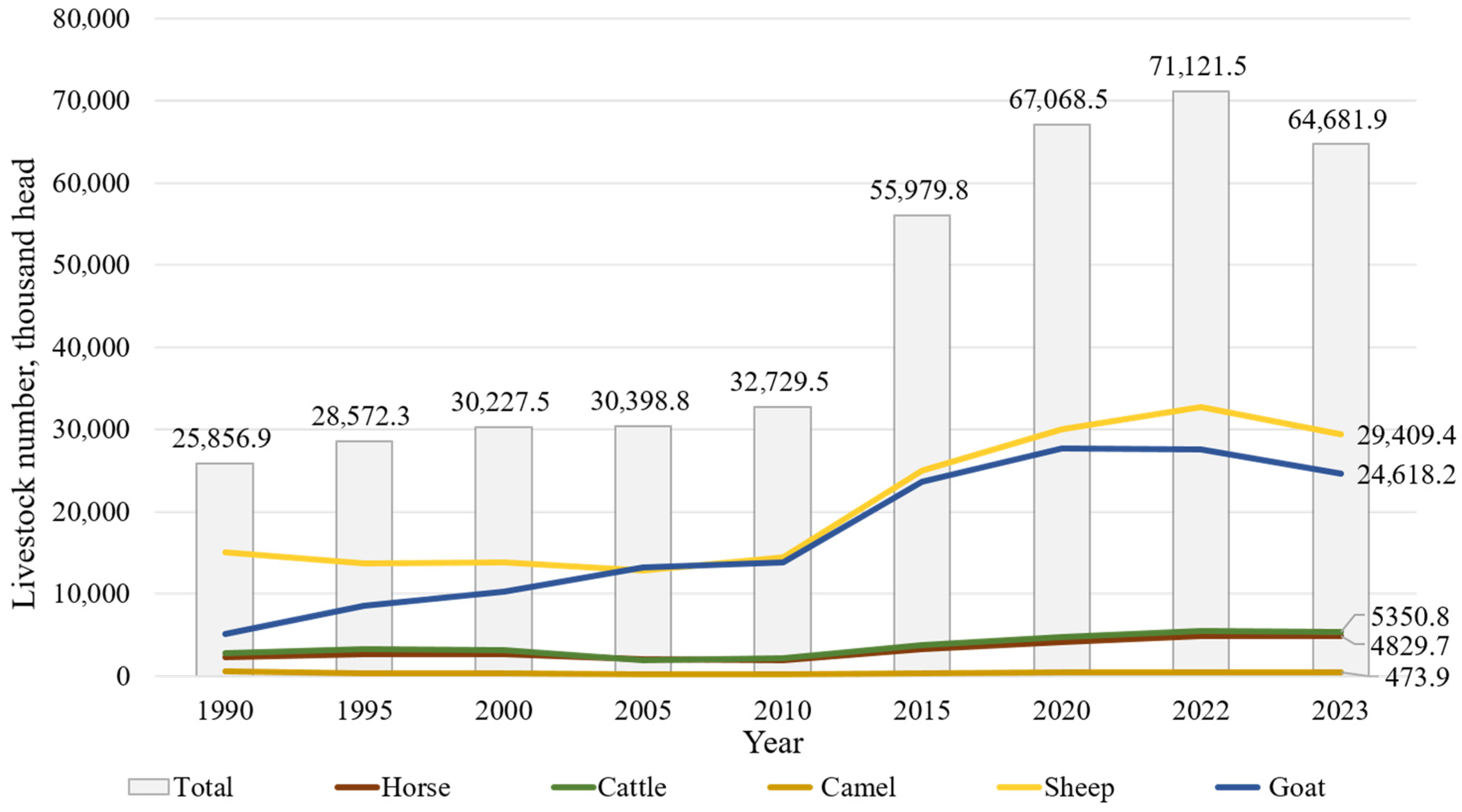 Historically, nomadic livestock farming has been the dominant sector of Mongolia’s economy. Traditionally, nomadic herders raise five types of livestock: horses, cattle, camels, sheep, and goats, with most pastoral activities organized at the family level. Between 1990 and 2023, the total livestock population increased 2.5-fold, reaching 64,681.9 thousand head (
