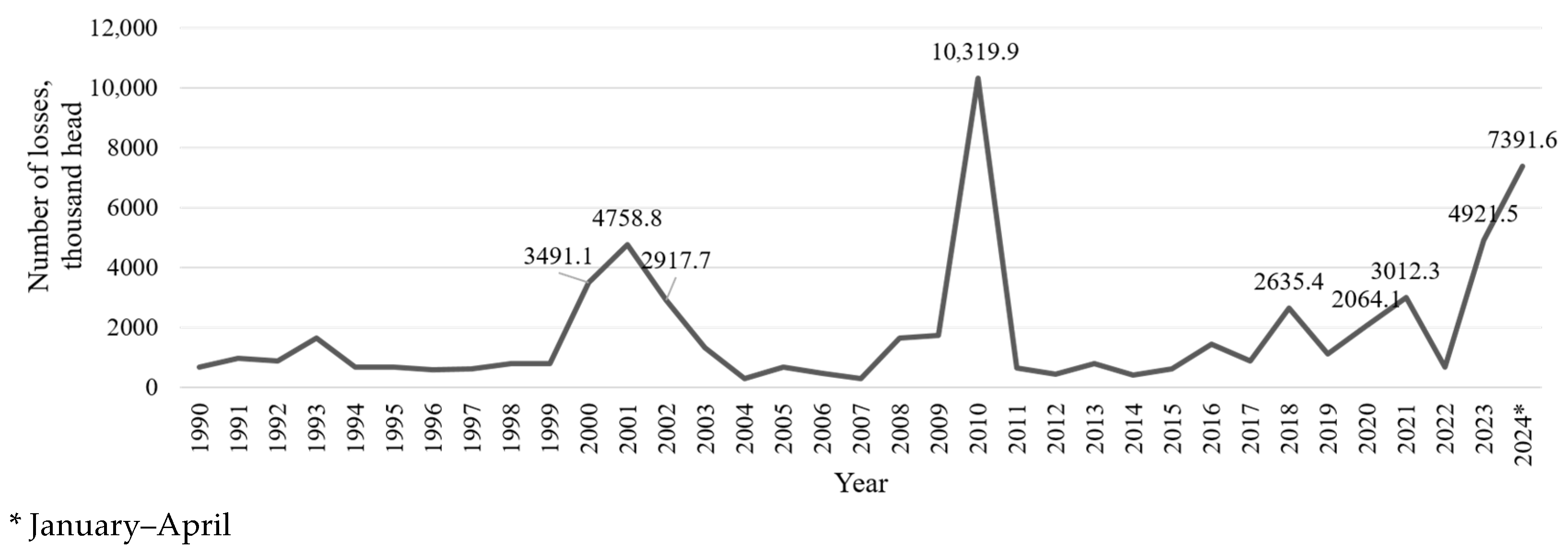 This study provided a comprehensive assessment of the impact of the 2023–2024 dzud on Mongolia’s nomadic livestock farming. It was found that the dzud disaster resulted in the death of 7.4 million livestock and caused losses of 1.5–1.9 billion USD. A sociological survey revealed that 63.3% of nomadic households experienced livestock losses. A key factor exacerbating the impact of the dzud disaster was systemic overgrazing, caused by a multiple increase in herd size in favor of sheep and goats, the most environmentally detrimental livestock species.