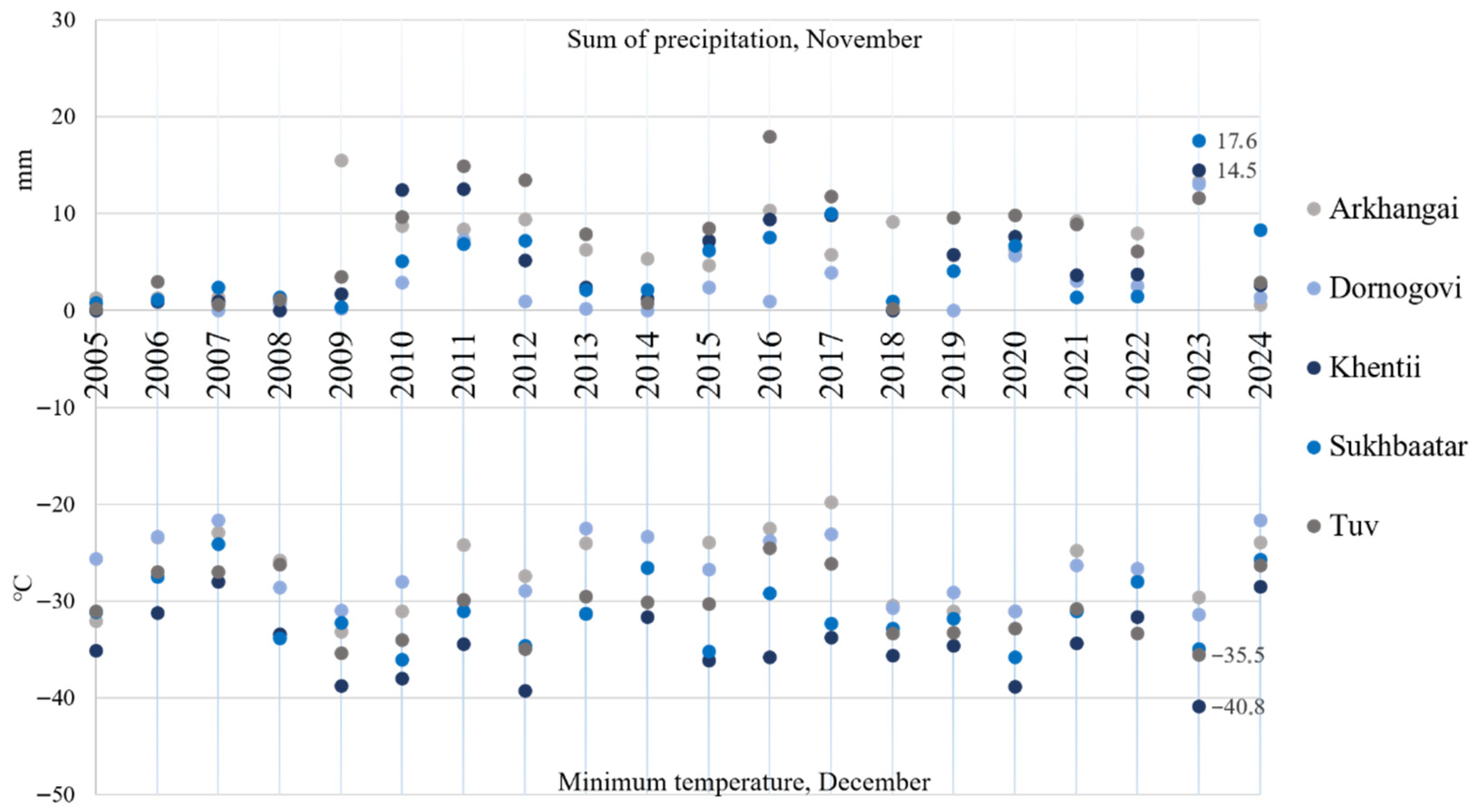 34], precipitation in November 2023 amounted to 17.6 mm in Sukhbaatar aimag and 14.5 mm in Khentii aimag (
