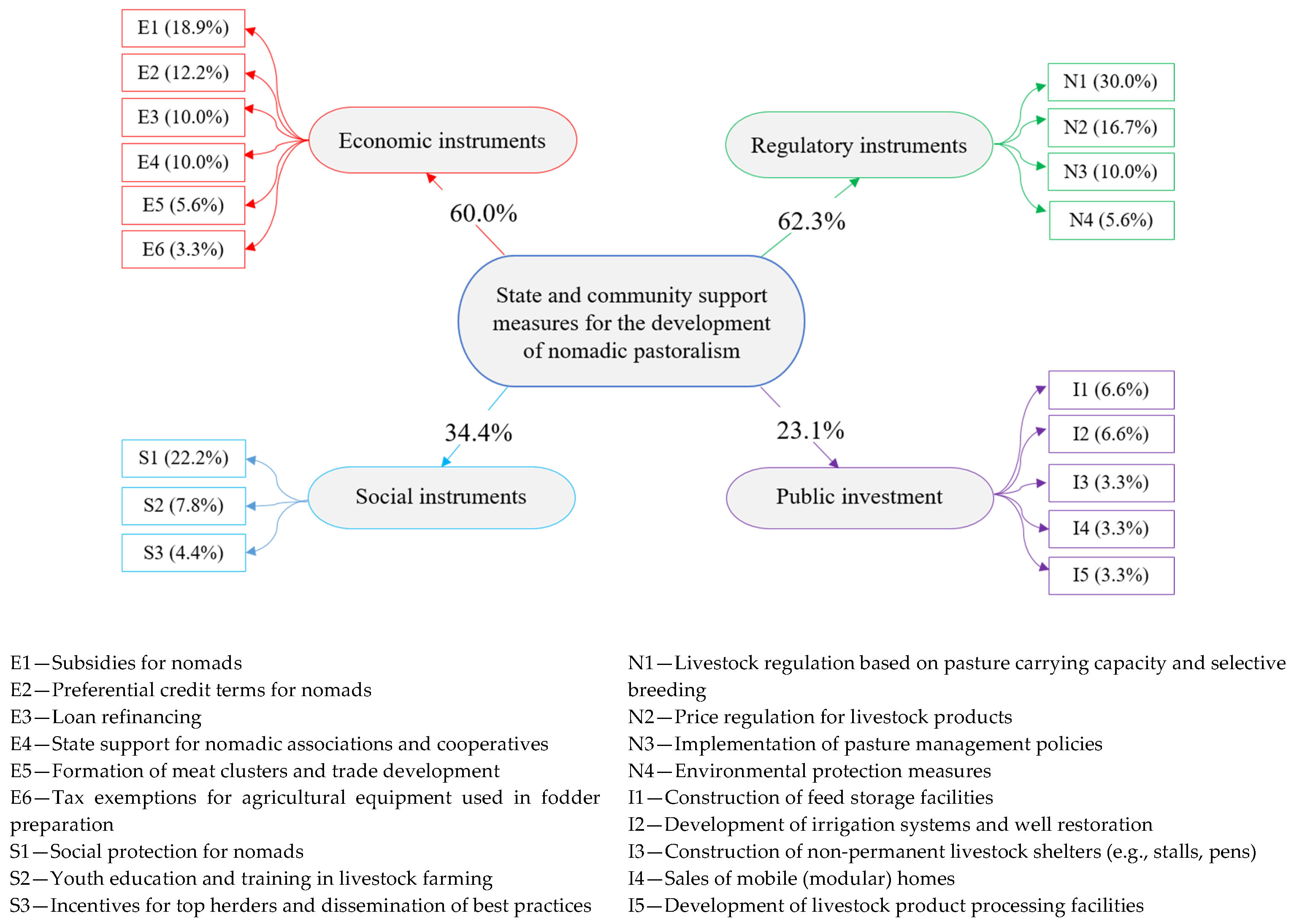 The text responses received from nomadic livestock farmers were subjected to qualitative content analysis and categorization. All proposed measures being systematized into four main groups: economic instruments (E), regulatory and environmental measures (N), social instruments (S), public investments (I). Within each group, specific measures (15 in total) were identified, such as subsidies (E1), livestock management (N1), social protection (S1), construction of feed storage facilities (I1), and others.
