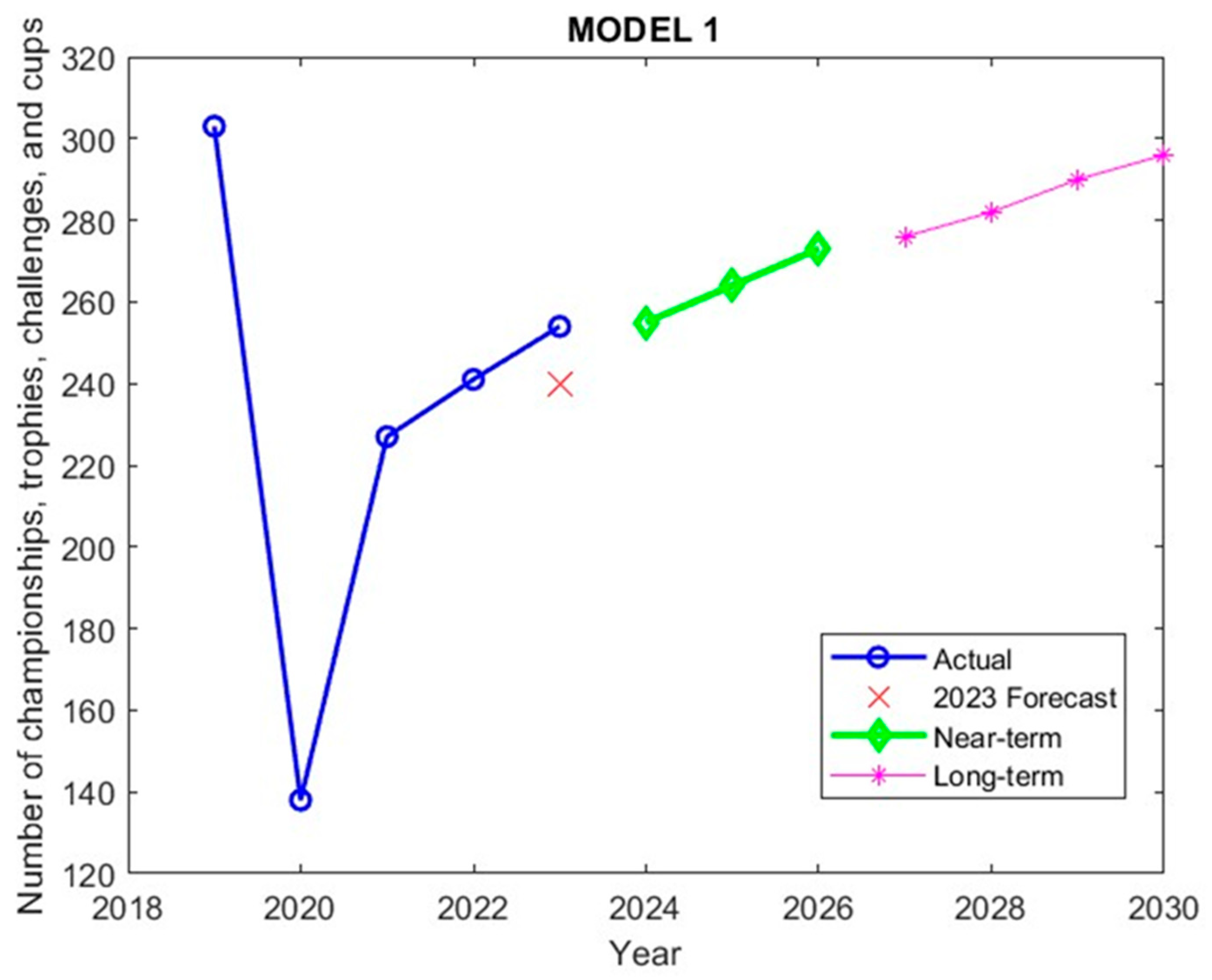 - Multi-Delta Analysis (2020 Perturbation): Artificial adjustments of ±5%, ±10%, and ±20% were applied to the 2020 data point to simulate noise or reporting inconsistencies. Across all future forecast years (2024–2030), these shocks produced no measurable impact on projected championship counts. The average, maximum, and minimum differences in forecasts remained at zero, confirming the model’s inherent resilience to outliers via its rolling-window smoothing mechanism.