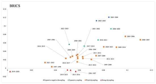 As shown in Figure 3, BRICS countries overall show a weak decoupling between CO2 emissions and economic growth. This means that economic growth and carbon emissions still change in step. Continuous economic growth has encouraged the accumulation of carbon emissions.